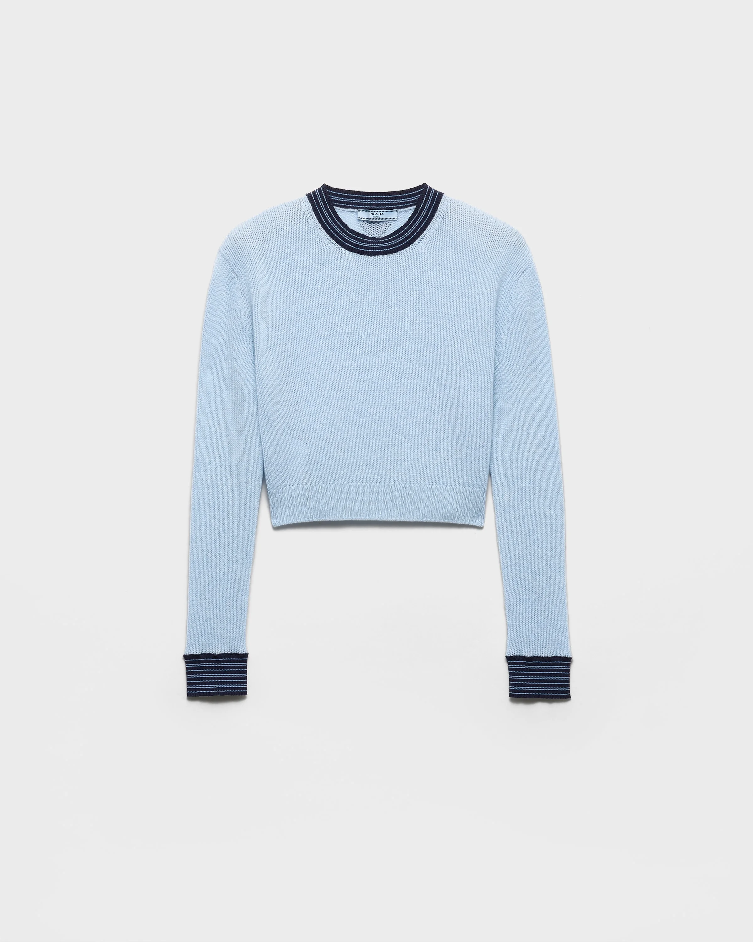 Contrasts in color and texture define the design of this fine cashmere sweater. The striped cuffs are made of cotton, deconstructing the classic idea of knitwear with sartorial elements. - Product code: P24B3A_19IK_F0013_S_OOO - Long sleeves - Plain knit - Boxy fit - Ribbed knit crew neck - Drop shoulder - Ribbed knit cuffs and hem - Knit triangle logo - The garment has striped cotton cuffs and crew neck. - Imported - The model is 179 cm tall and wears a size 38 Height: 52cm MATERIALS Main material: 100% Cashmere