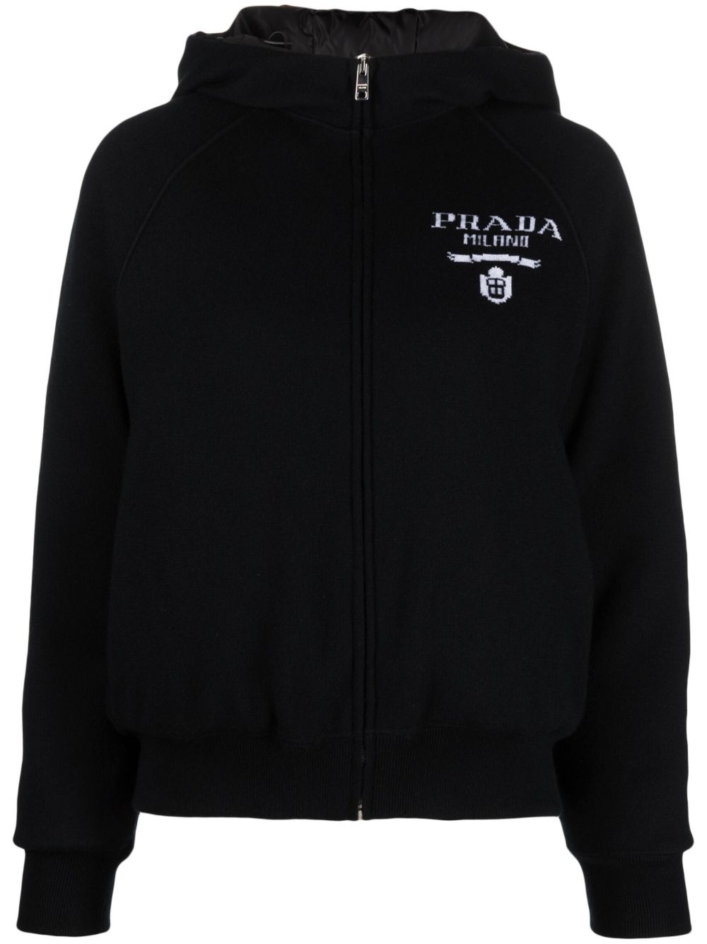 logo-intarsia cashmere-blend hooded jacket Prada's knitted jacket is spun from a plush cashmere blend for softness and warmth - it's filled with down feathers for added insulation. The contrasting intarsia-knit logo at the chest is accented against the black background. Composition Outer: Cashmere 97%, Polyamide 3% Lining: Polyester 100%, Feather Down 100% SIZE & FIT Model measurements Height 5 ft 10 in(1.78 m) Bust/Chest 30.7 in(78 cm) Hips 34.64 in(88 cm) Waist 23.22 in(59 cm)