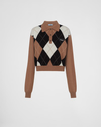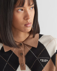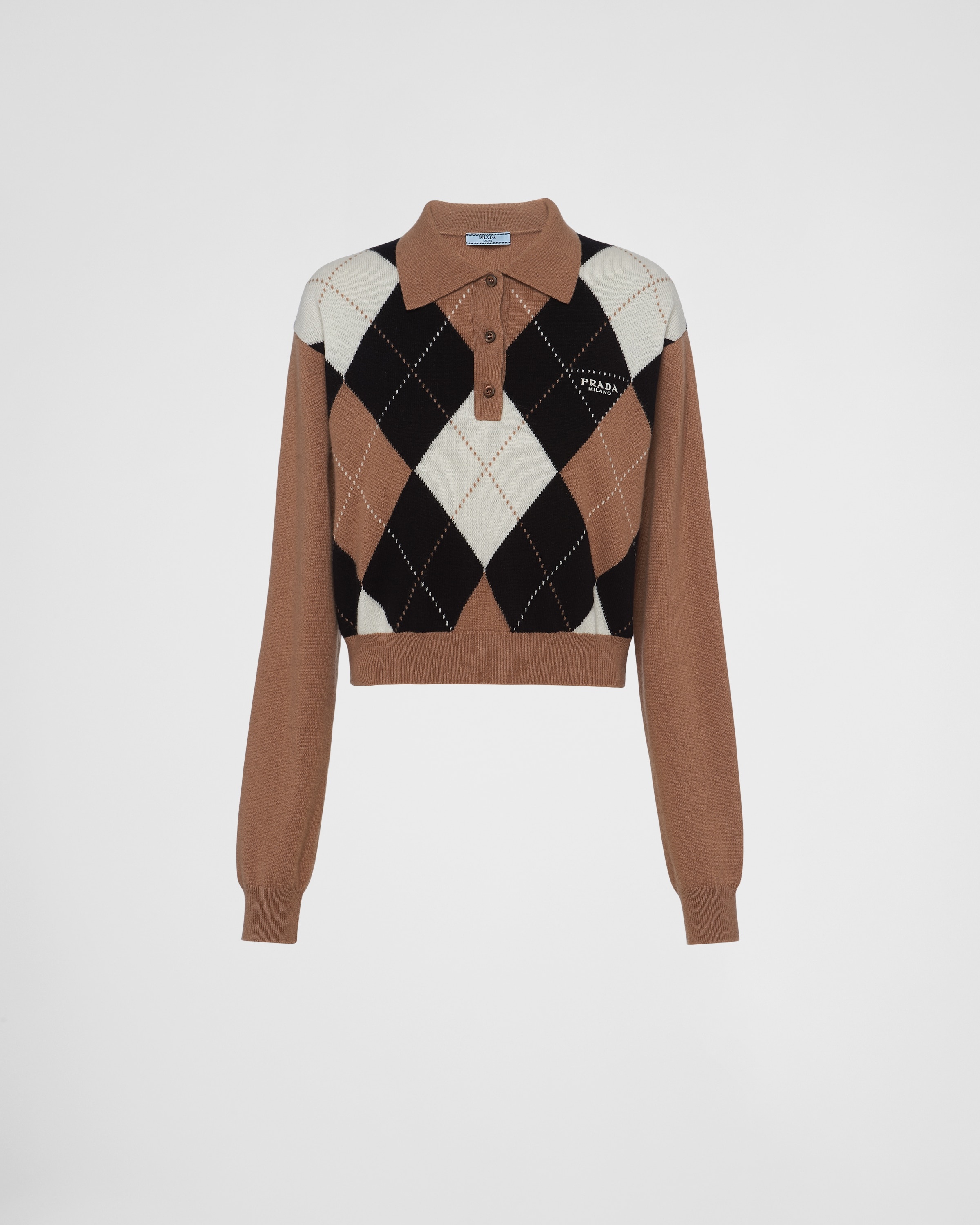 Prada blends innovative spirit and Italian know-how to create high-quality cashmere that is warm, cozy, and extremely soft to the touch. The sportswear-inspired polo shirt is reimagined in this fine yarn with a diamond-shaped intarsia motif. - Product code: P24Z1V_12DB_F040X_S_231 - Long sleeves - Diamond-shaped intarsia knit - Menswear fit - Ribbed knit collar - Regular shoulder - Ribbed knit cuffs and hem - Intarsia logo - Front button closure - Height: 46cm - Imported MATERIALS Cashmere