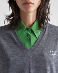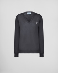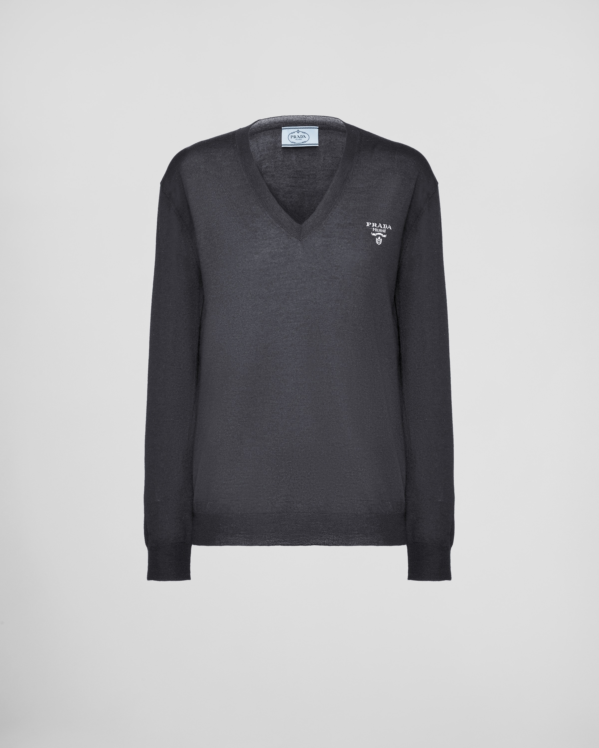 Sleek elegance defines the style of this V-neck cashmere sweater. The fine intarsia knit lettering logo stands out on the front. - 商品货号: P24Q1U_102T_F0480_S_221 - Long sleeves - Plain knit - Masculine cut - Ribbed knit collar - Semi-raglan shoulders - Ribbed knit cuffs and hem - Intarsia logo - 产品标签信息 高度: 62cm MATERIALS Cashmere