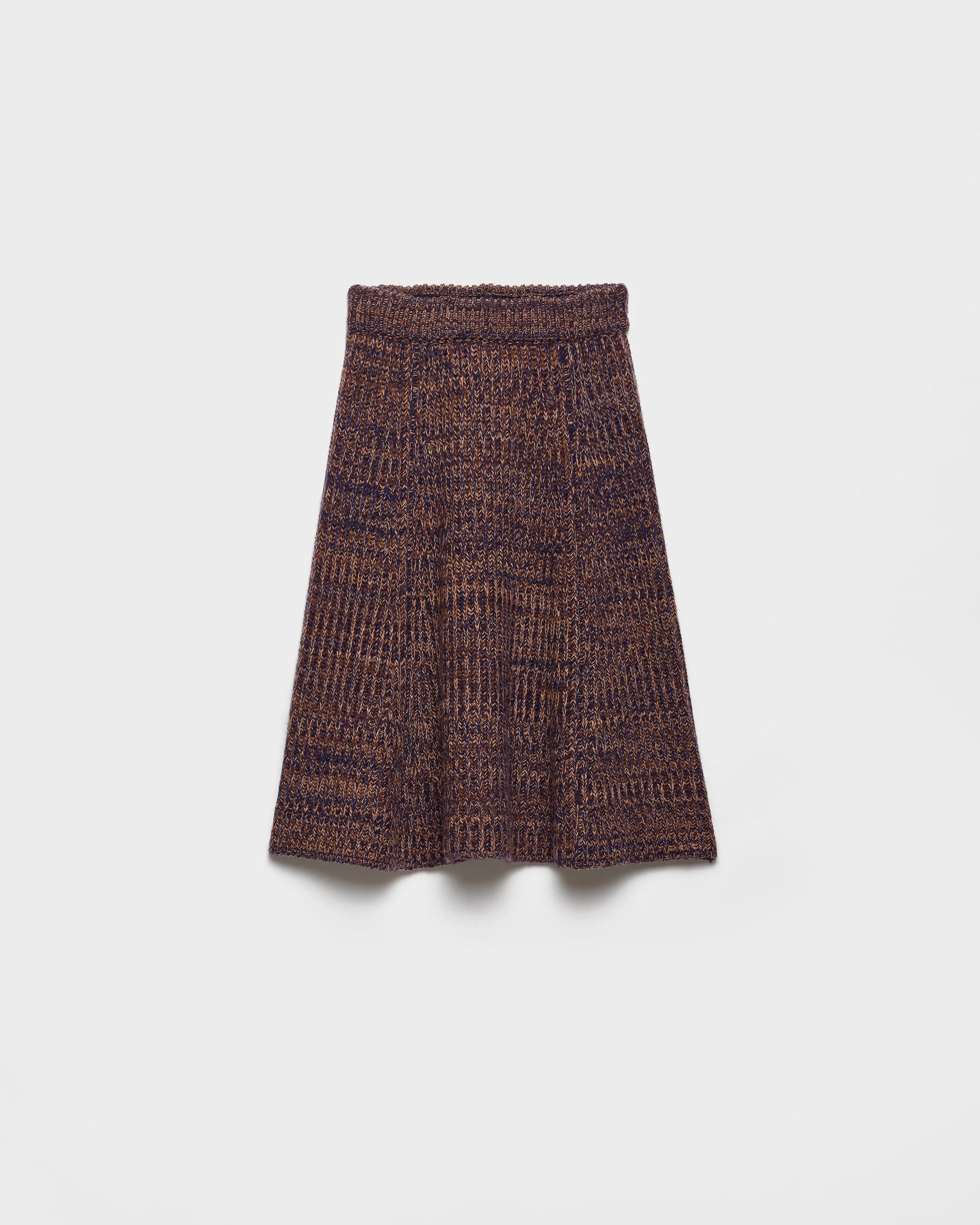 Balancing softness and structure, this skirt has a sophisticated flared silhouette and is made with a precious wool and cashmere blend. The ribbed knit enhances the texture of the garment and is completed with the tonal triangle logo. - Product code: 21559_172F_F0XB7_S_OOO - Ribbed knit - Flared-fit - Knit triangle logo - Imported - The model is 177 cm tall and wears a size 38 Height: 62cm MATERIALS Main material: 30% cashmere 70% virgin wool