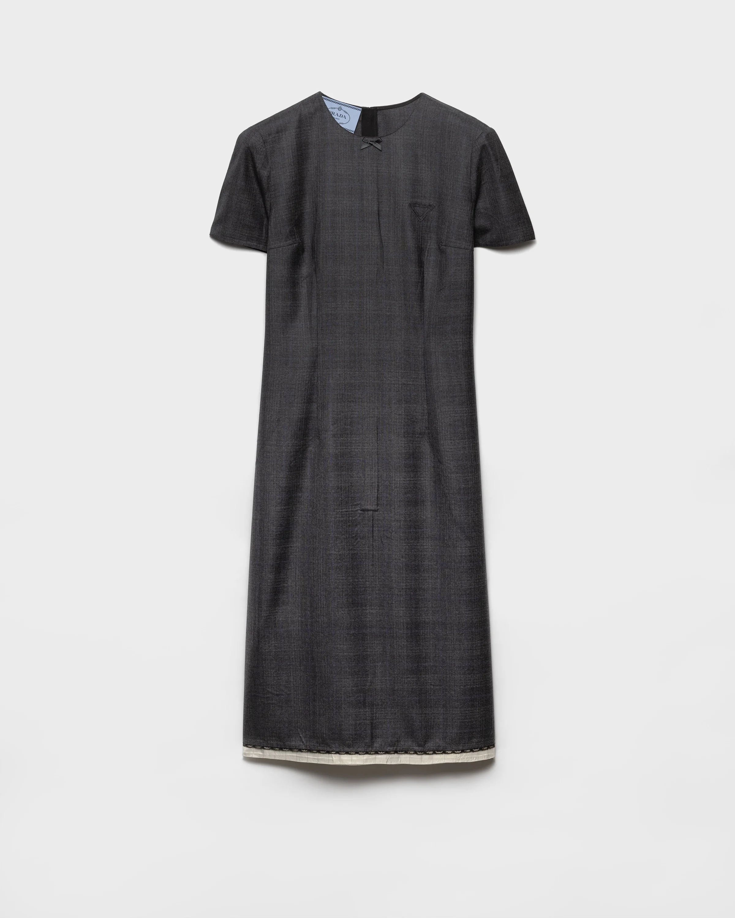 The sheath silhouette meets a print with rigorous allure. The lace hem adds contrast, making the look surprising and refined. The dress celebrates femininity through a precise shape. - Product code: P3O78M_1N01_F0308_S_OOO - Check print - Sheath dress silhouette - Unlined - Round neck - Back zipper closure - Short sleeves - Fabric triangle logo - Lace-trimmed hem - Imported - The model is 181 cm tall and wears a size 38 Height: 105cm MATERIALS Main material: 100% Virgin Wool