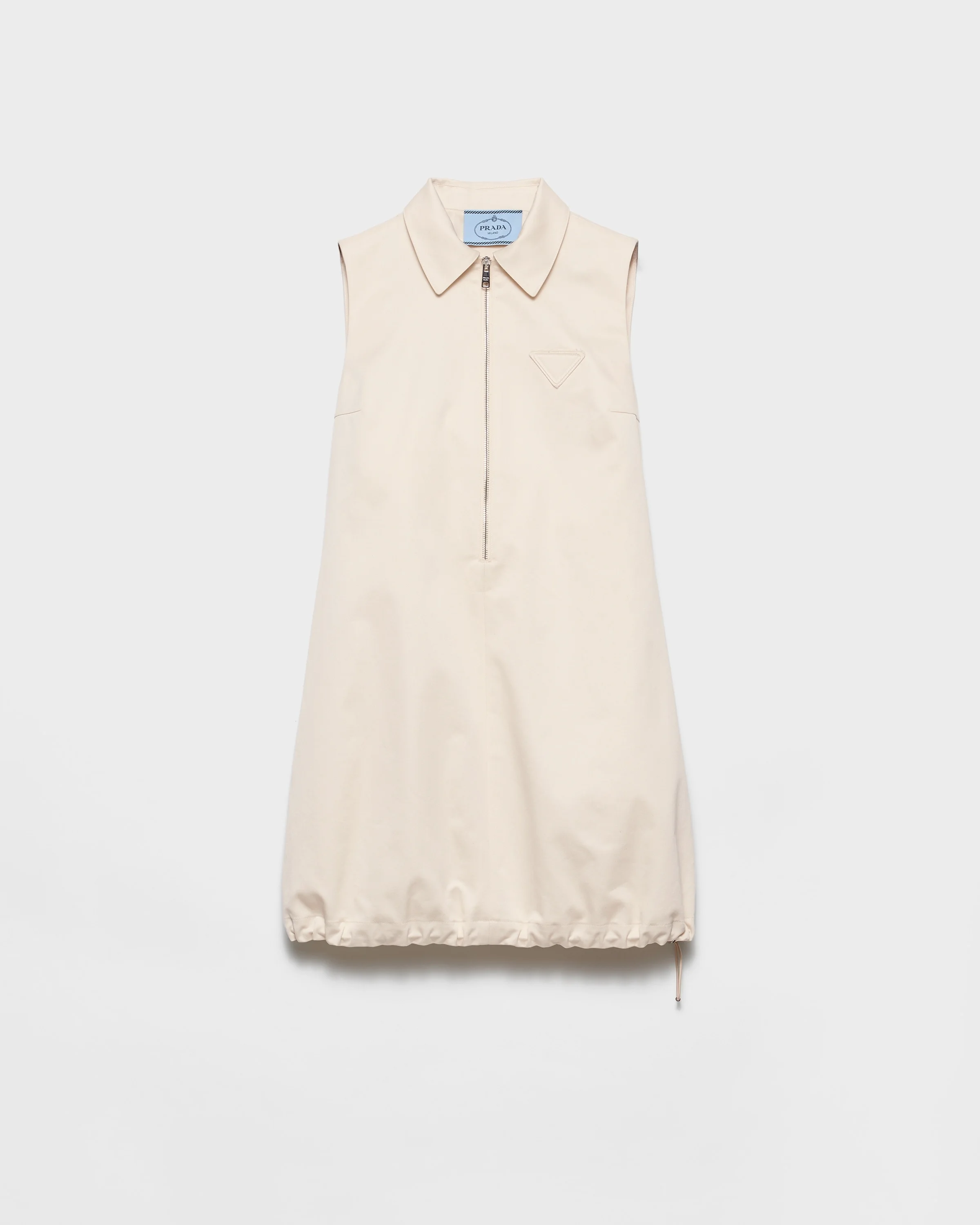 Clean lines and sleek details define this mini-dress with contemporary elegance. The minimalist silhouette plays with feminine elements and sporty touches, while the drawstring hem adds soft volume to the style. - Product code: P3Q81_10YP_F0018_S_OOO - Unlined - Shirt collar - Front zipper closure - Sleeveless - Inseam pockets - Fabric triangle logo - Flared hem - Drawstring hem - Imported - The model is 178 cm tall and wears a size 38 Height: 85cm MATERIALS Main material: 100% cotton