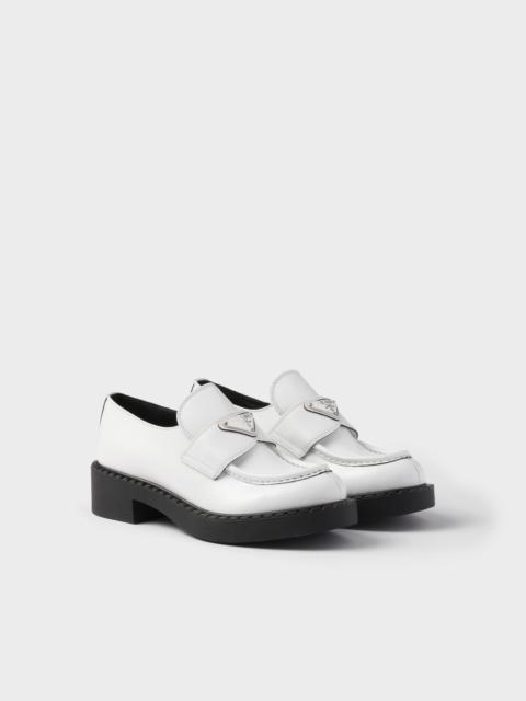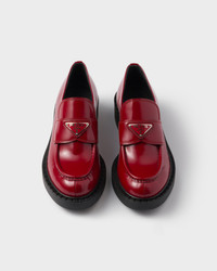 Emphasized by the iconic enameled triangle logo, these retro-inspired loafers are made of brushed leather, traditionally used in classic fine footwear and reinterpreted in Prada collections on unexpected designs for a hybrid result that reflects the duality of the brand. The notched effect of the welt around the shoe gives it a handcrafted touch. - Product code: 1D246M_ULS_F0041_F_G050 - Enameled metal triangle logo - 50 mm rubber monobloc sole with hot-stamped logo - Notched-effect stamped rubber welt - Imported MATERIALS Main material: Calfskin