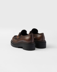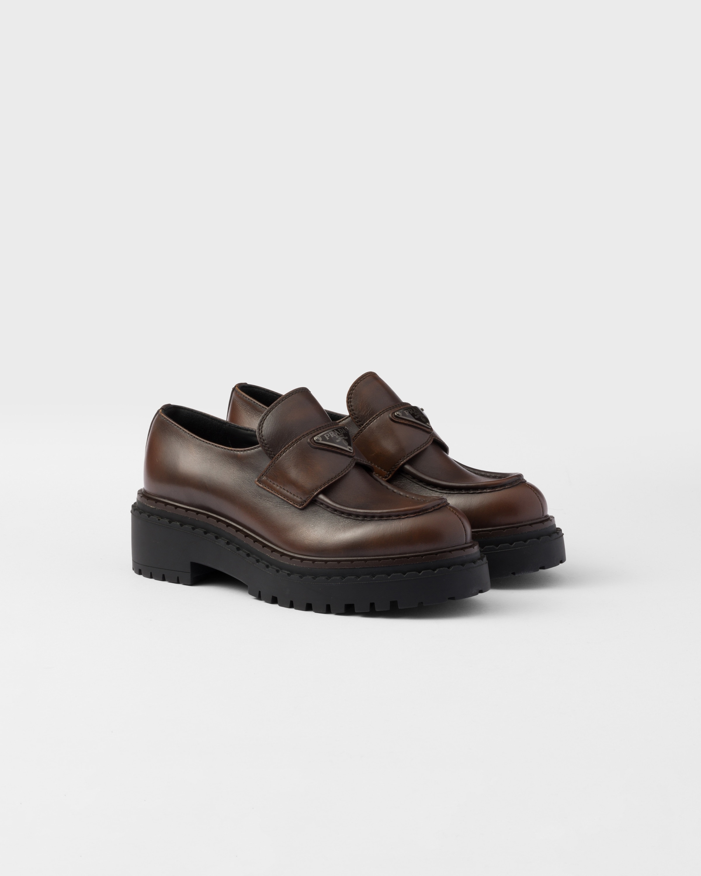 Finely crafted details and contemporary elements animate the design of these leather loafers with chunky rubber soles in a new interpretation of an iconic style. - Product code: 1D246M_3LPV_F0003_F_G055 - Upper with leather band - Enameled metal triangle logo - Monoblock rubber sole with lug tread, 55 mm, and hot-stamped logo - Double rubber welt with notched effect - Imported MATERIALS Leather