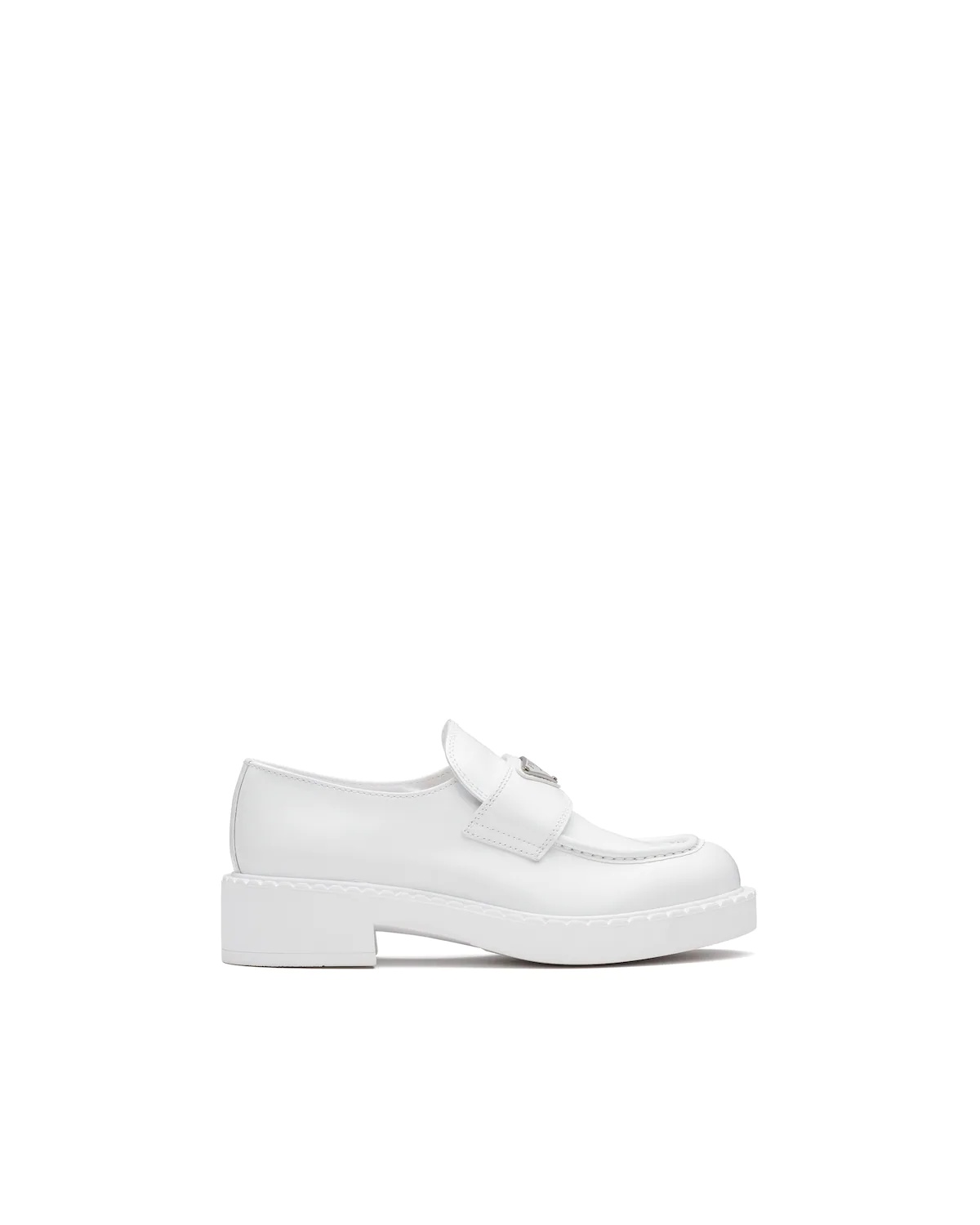 Emphasized by the iconic enameled triangle logo, these retro-inspired loafers are made of brushed leather, traditionally used in classic fine footwear and reinterpreted in Prada collections on unexpected designs for a hybrid result that reflects the duality of the brand. The notched effect of the welt around the shoe gives it a handcrafted touch. - Product code: 1D246M_ULS_F0009_F_B050 - Upper with leather strap - Enameled metal triangle logo - 50 mm rubber monobloc sole with hot-stamped logo - Notched-effect stamped rubber welt MATERIALS Leather