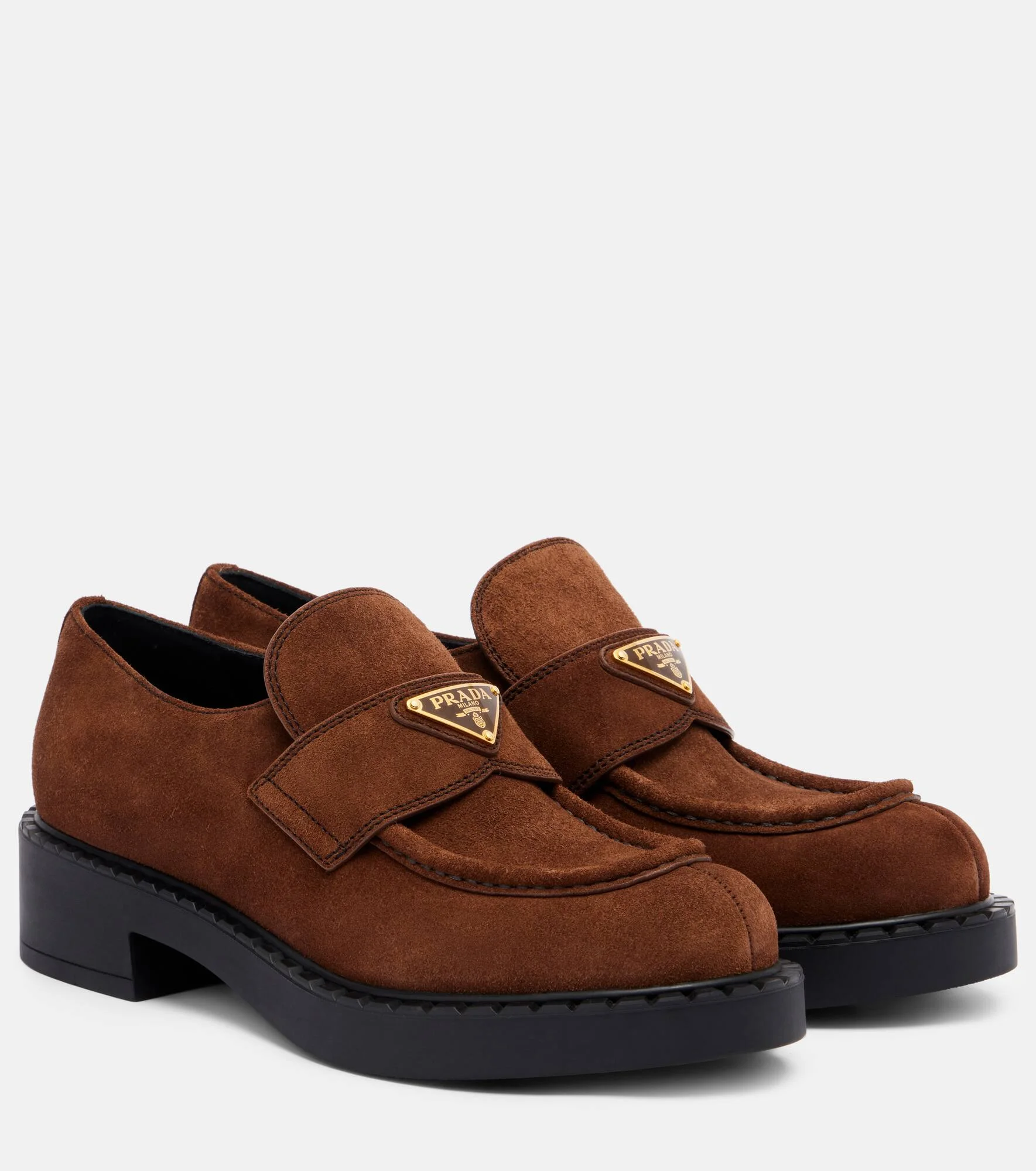 Prada reinvents a signature style with these Chocolate loafers. Crafted from suede, the pair is set on chunky soles and finished with gold-toned logo plaques on the uppers, for a distinctive touch. Product Details - Upper: calf leather (suede) - Lining: leather - Sole: leather insole, rubber sole - Toe shape: round toe - Made in Italy - Includes: shoe box, dust bag - Designer color name: Cacao - Item color: brown - Hardware color: gold - Item number: P01126913 Size & Fit - True to size - For narrow feet, we recommend trying a half size smaller - European sizes - 2.5cm-1" platform (size EU 38) - 4cm-1.5" wedge heel (size EU 38)