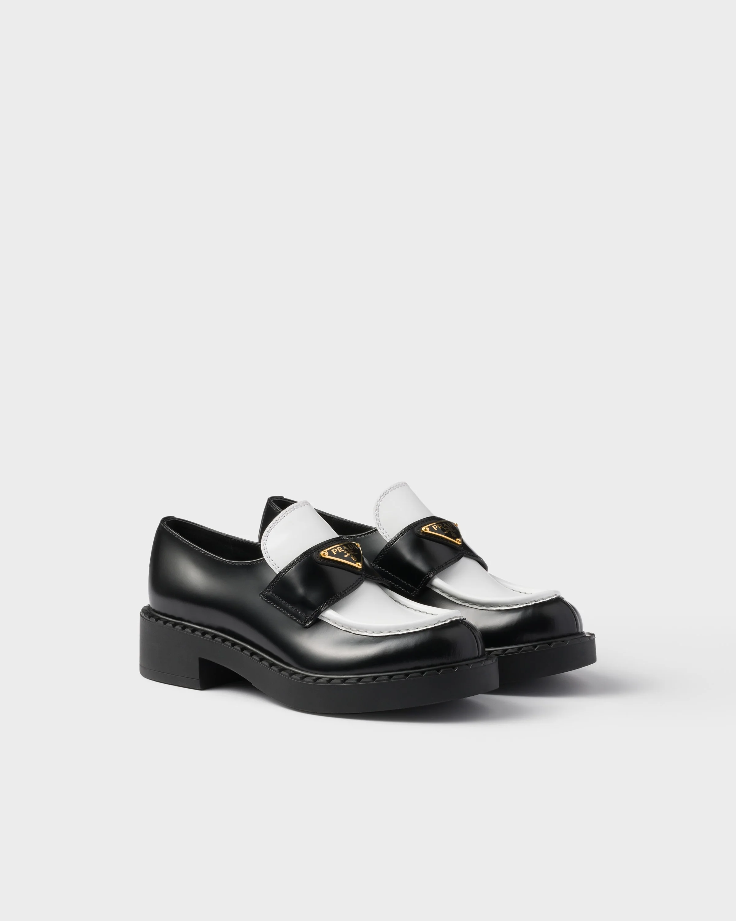 Chocolate loafers, a distinctive design of the Prada universe, embody a versatile, refined style. The hybrid silhouette is characterized by the juxtaposition of classic materials and details with the modernist volumes of the rubber soles. Bold color contrasts animate this brushed leather version completed by the emblematic enameled metal triangle logo. - Product code: 1D246M_AZ3_F0967_F_G050 - Upper with leather band - Enameled metal triangle logo - Monoblock rubber sole, 50 mm, with hot-stamped logo - Notched-effect rubber welt - Imported MATERIALS Main material: Calfskin