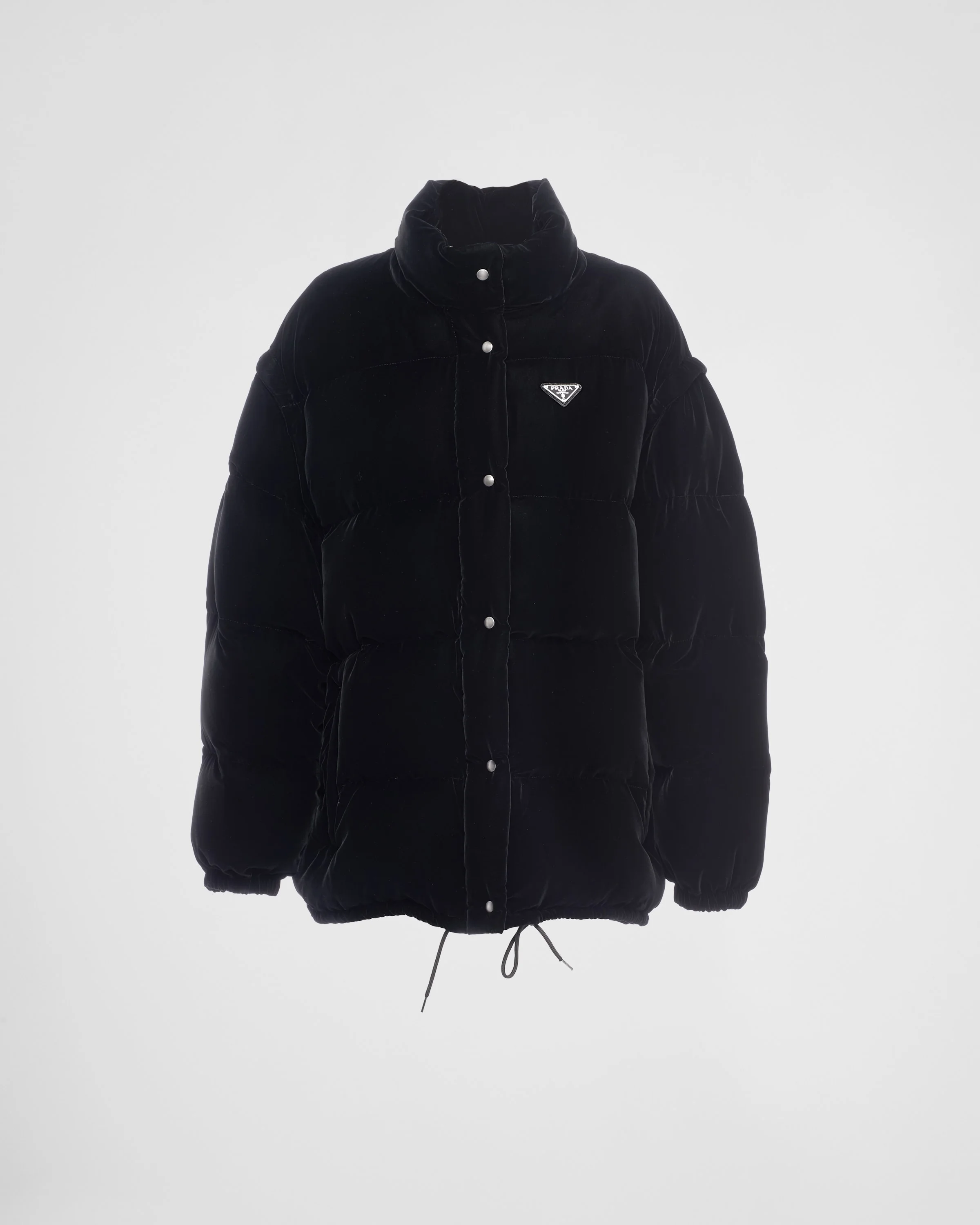 Oversized volumes and new materials mix to create a new outerwear concept that reflects the characteristic duality of Prada collections. This velvet down jacket reveals its versatile hybrid soul, transforming into a vest thanks to the removable sleeves. The brand's emblematic enameled metal triangle logo decorates the design. - Product code: 29X805_1XJX_F0002_S_222 - Medium down jacket - Goose-down padding - Stand-up collar - Detachable sleeves - Elasticized cuffs - Zipper and snap closure - Welt pockets with zipper - Drawstring hem - Enameled metal triangle logo - Small inner zip pocket - Re-Nylon down lining - Comfortable regular fit, the garment fits up to two sizes larger - Imported - The model is 180 cm tall and wears a size 38 Height: 75cm MATERIALS Main material: 30% cupro 70% viscose