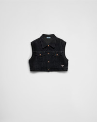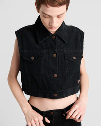 This corduroy vest stands out for its relaxed attitude and vintage-inspired details that enrich the boxy silhouette. - Product code: GFB312_1449_F0557_S_OOO - Garment-dyed treatment - Unlined garment - Loose fit - Classic collar - Button closure - Matching stitching - Flapped pockets with button on the chest - Center-back length: 42 cm, Size: XS - Straight hem with buttons for double adjustment on the back - Triangle logo - Strap with buckle on the back - Prada Milano logo label on the back - Imported - The model is 178 cm tall and wears a size 38 Height: 42cm MATERIALS Main material: 100% cotton