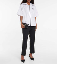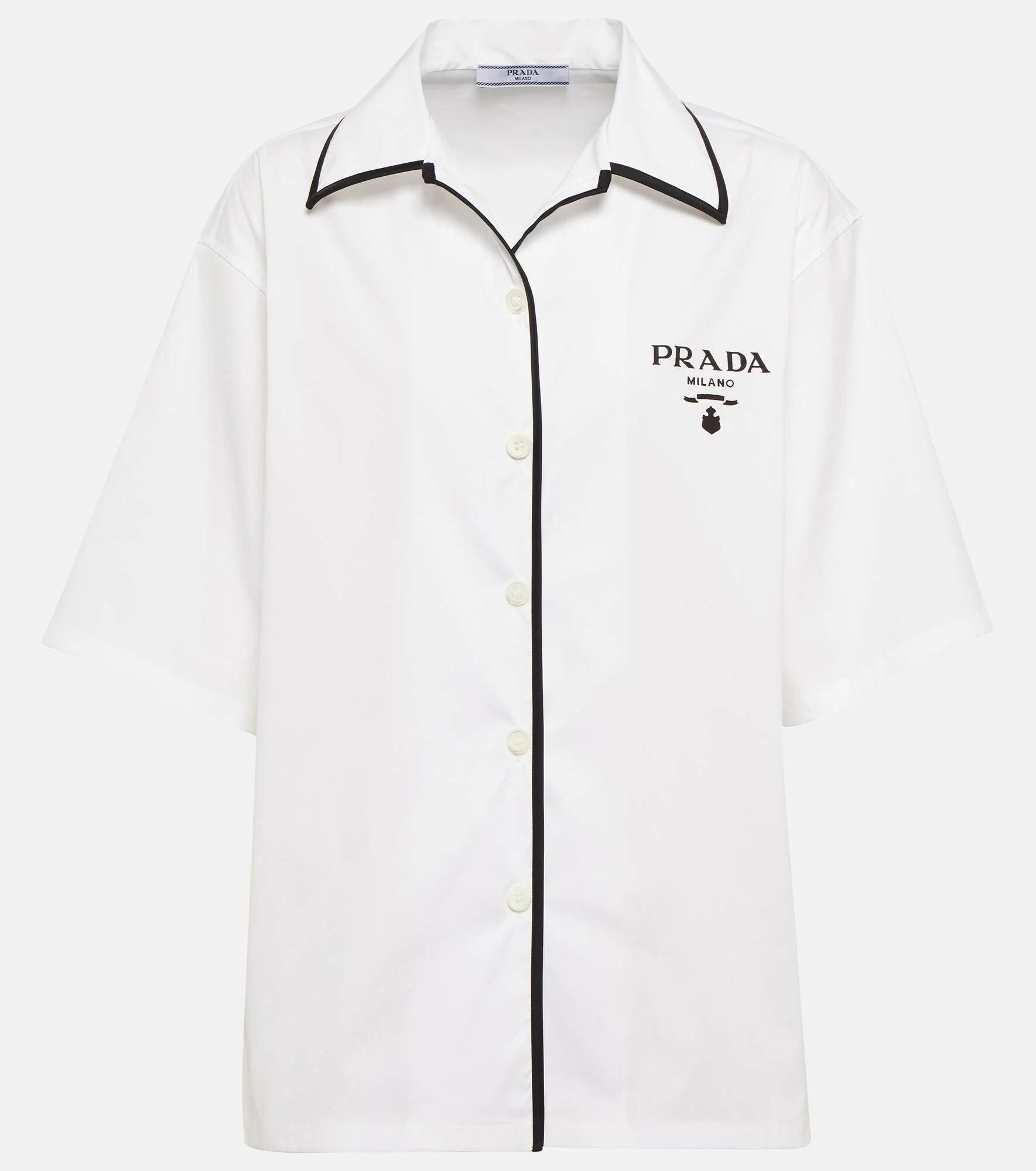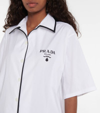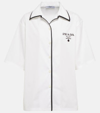 This shirt from Prada draws inspiration from menswear bowling designs. It's made from a crisp cotton-blend with contrasting pajama-style piping and unmissable logo embroidery at the chest. Product Details - Material: 78% cotton, 19% polyamide, 3% elastane - Made in Italy - Closure: buttoned front - Designer color name: Bianco - Care instructions: dry clean - Details: 100% polyamide - Item number: P00635419 Size & Fit - True to size - Dropped shoulders - Oversized - Falls below the hip - The model seen in the picture is 178cm-5'10" and wearing a size IT 40