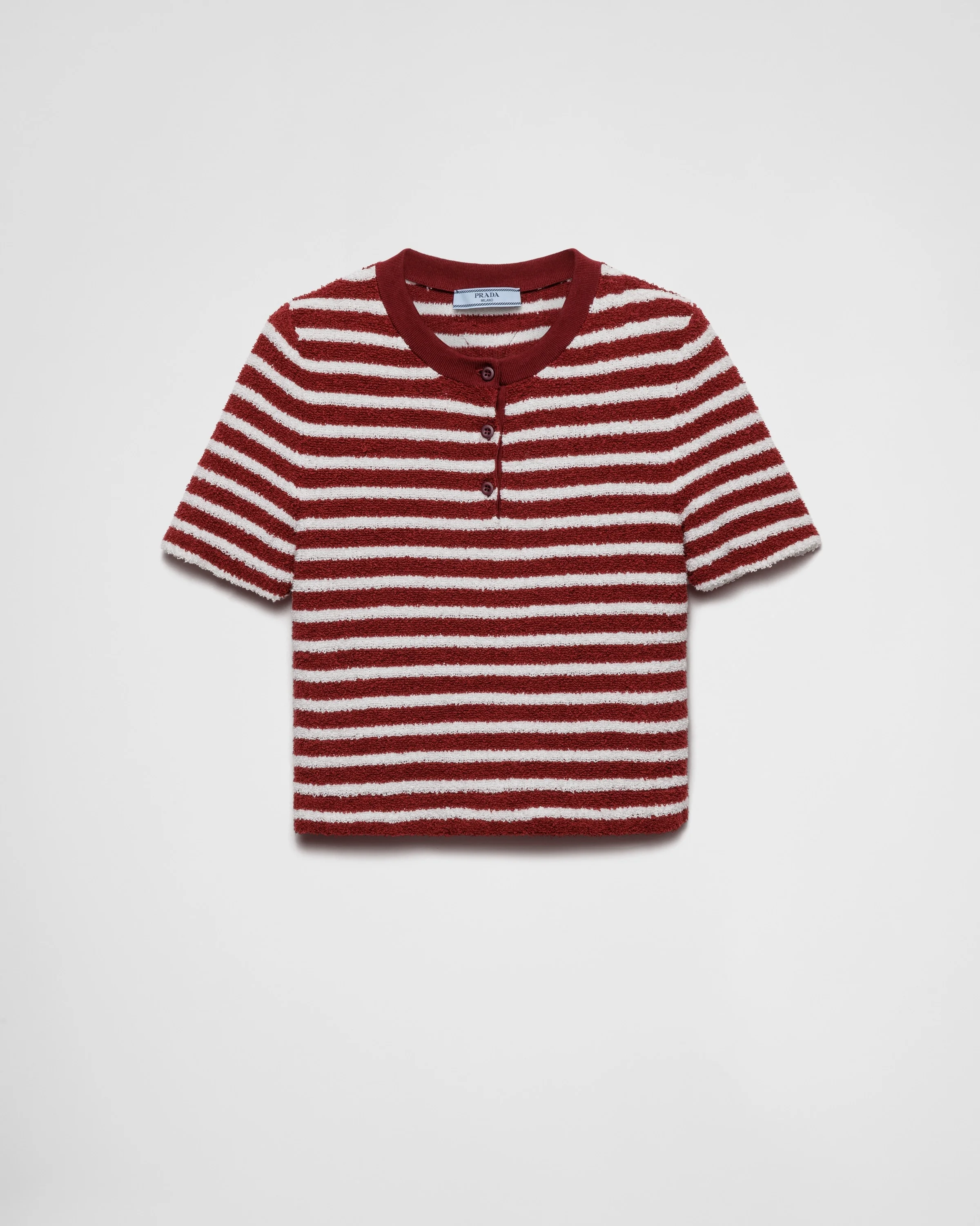 A new relaxed approach is inspired by the freshness of summer. This cotton boucle sweater blends retro elements with touches of modern romanticism. - Product code: P24N2T_16VI_F038I_S_OOO - Short sleeves - Striped knit - Boxy fit - Ribbed knit crew neck - Regular shoulder - Knit triangle logo - Front-button closure - Imported - The model is 176 cm tall and wears a size 38 Height: 42cm MATERIALS Main material: 65% cotton 35% polyamide