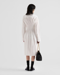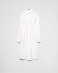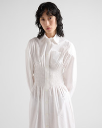 The shirt-dress is reinterpreted with contemporary volumes that define a refined, feminine silhouette enriched with a smocking motif that emphasizes the lines of the design. - Product code: P3P75R_16NT_F0009_S_OOO - Fit and flare - Unlined - Shirt collar - Center front button closure - Sleeves with shirt cuffs - Patch pocket on the chest - Fabric triangle logo - Flared hem - Smocking stitch motif - Imported - The model is 180 cm tall and wears a size 38 Height: 115cm MATERIALS Main material: 100% cotton