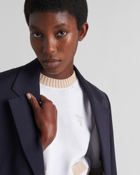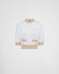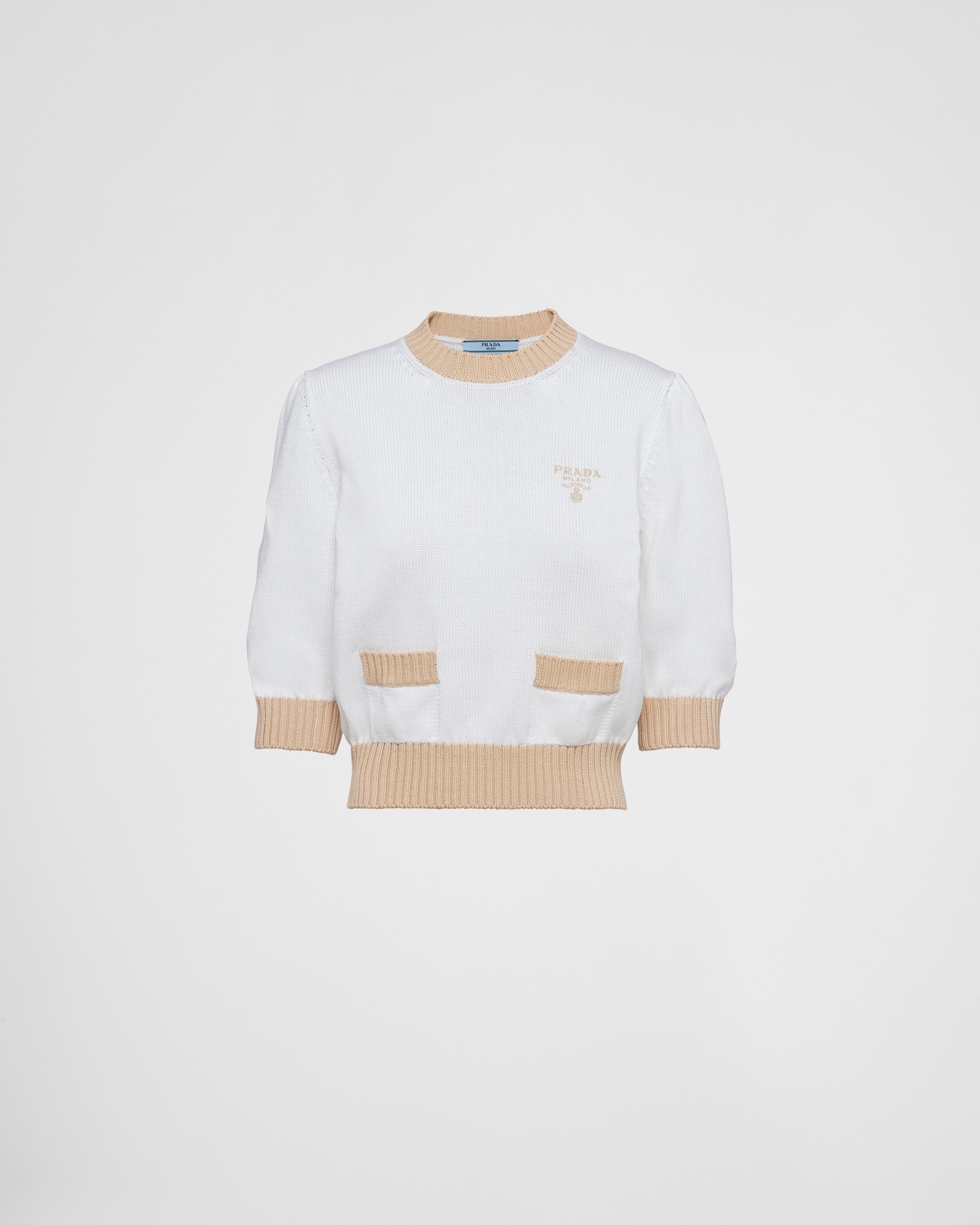This refined, elegant crew-neck sweater is defined by its minimalist design and color contrasts that give it retro charm. The ribbed knit trim and saddle shoulder accentuate the femininity of the garment decorated with the embroidered logo. - Product code: P24I1R_1ZO5_F0P09_S_212 - Plain stitch knit - Cropped fit - Ribbed knit collar - Saddle shoulder - Short sleeves - Ribbed knit sleeve trim and hem - Embroidered logo - Imported - The model is 178 cm tall and wears a size 38 Height: 45cm MATERIALS Cotton