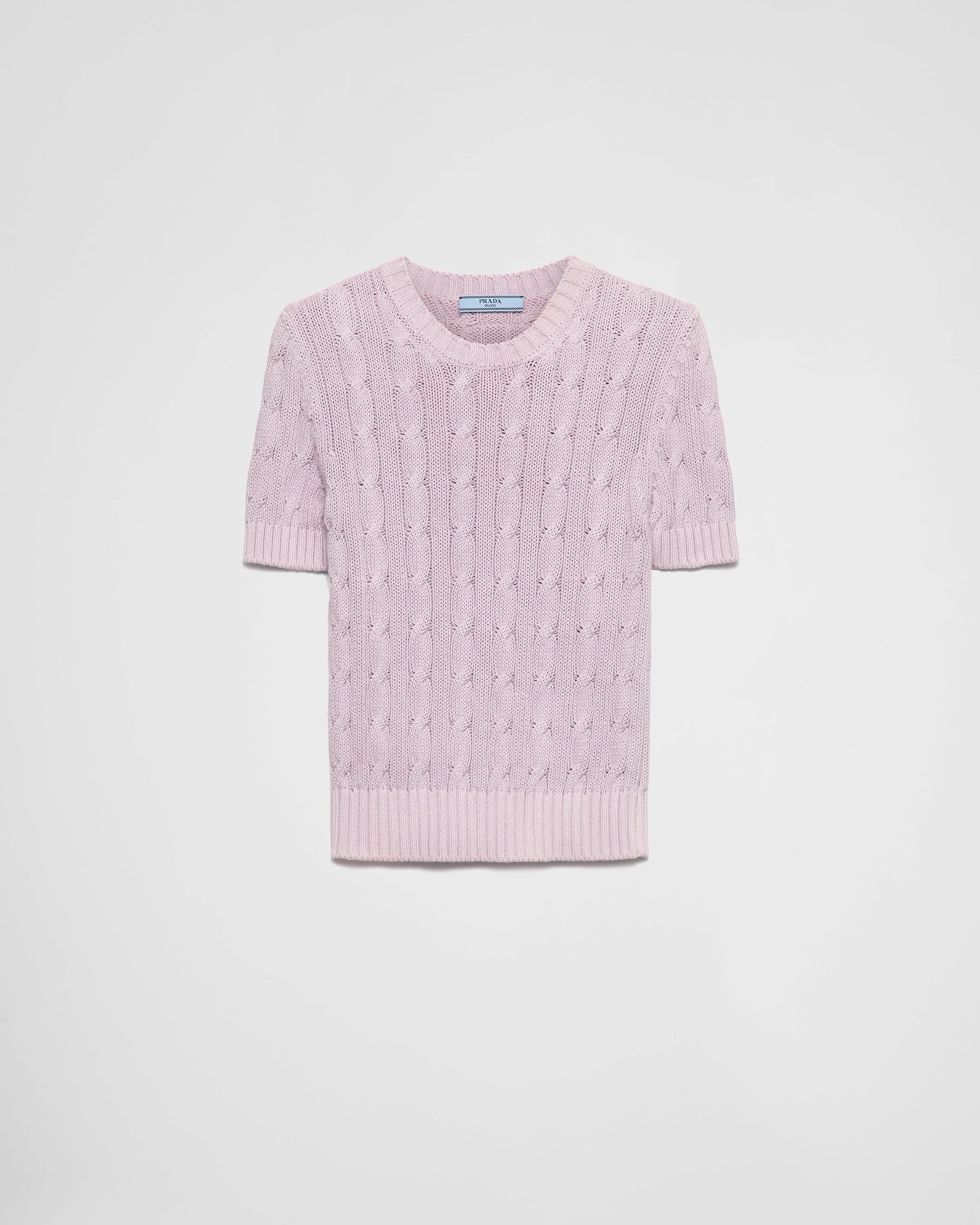 The boxy silhouette of this short-sleeved sweater is enriched by the cable-knit motif that adds preppy charm to the design. - Product code: P24N2O_16VQ_F0203_S_OOO - Short sleeves - Cable-knit motif - Boxy fit - Ribbed knit crew neck - Regular shoulder - Ribbed knit sleeve trim and hem - Knit triangle logo and logo label - Imported - The model is 178 cm tall and wears a size 38 Height: 50cm MATERIALS Main material: 100% cotton