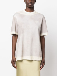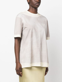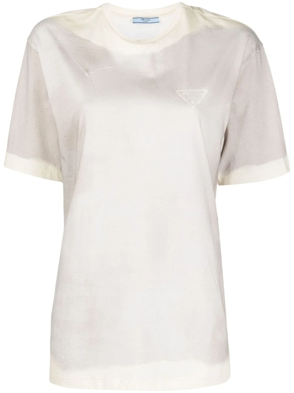 round-neck short-sleeve top Prada is known for creating minimalist silhouettes and often using a monochromatic colour palette. This is reflected on this short-sleeve top which is constructed from lightweight cotton material in a beige hue. Highlights - Beige - Cotton - Round neck - Short sleeves Composition Cotton 100% SIZE & FIT Model measurements Height 5 ft 10 in(1.77 m) Bust/Chest 32.28 in(82 cm) Hips 35.03 in(89 cm) Waist 25.19 in(64 cm) FittingInformation Designed to be unstructured, offering a loose fit throughout Made from a midweight non-stretch fabric, this piece offers minimal elasticity when worn This piece fits true to size – take your usual size