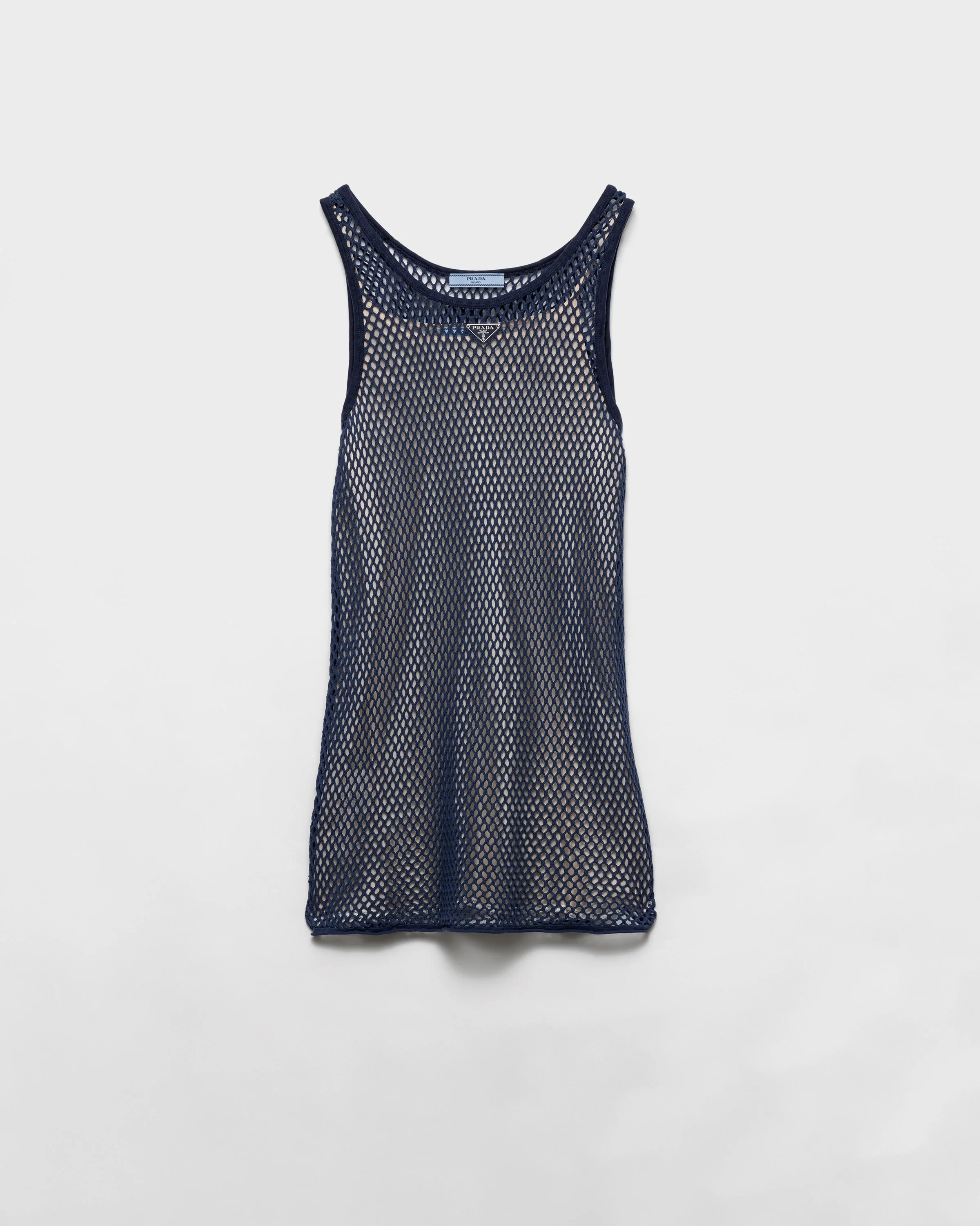 This mesh dress made of fine cotton yarn creates a transparent effect that plays with light, expressing the lightness and elegance of summer. - Product code: 33605_16ND_F0008_S_OOO - Flared fit - With slip - Scoop neck - Side closure with hidden snaps - Sleeveless - Enameled metal triangle logo - Raw-cut jersey hem - Imported - The model is 178 cm tall and wears a size 38 MATERIALS Main material: 100% cotton