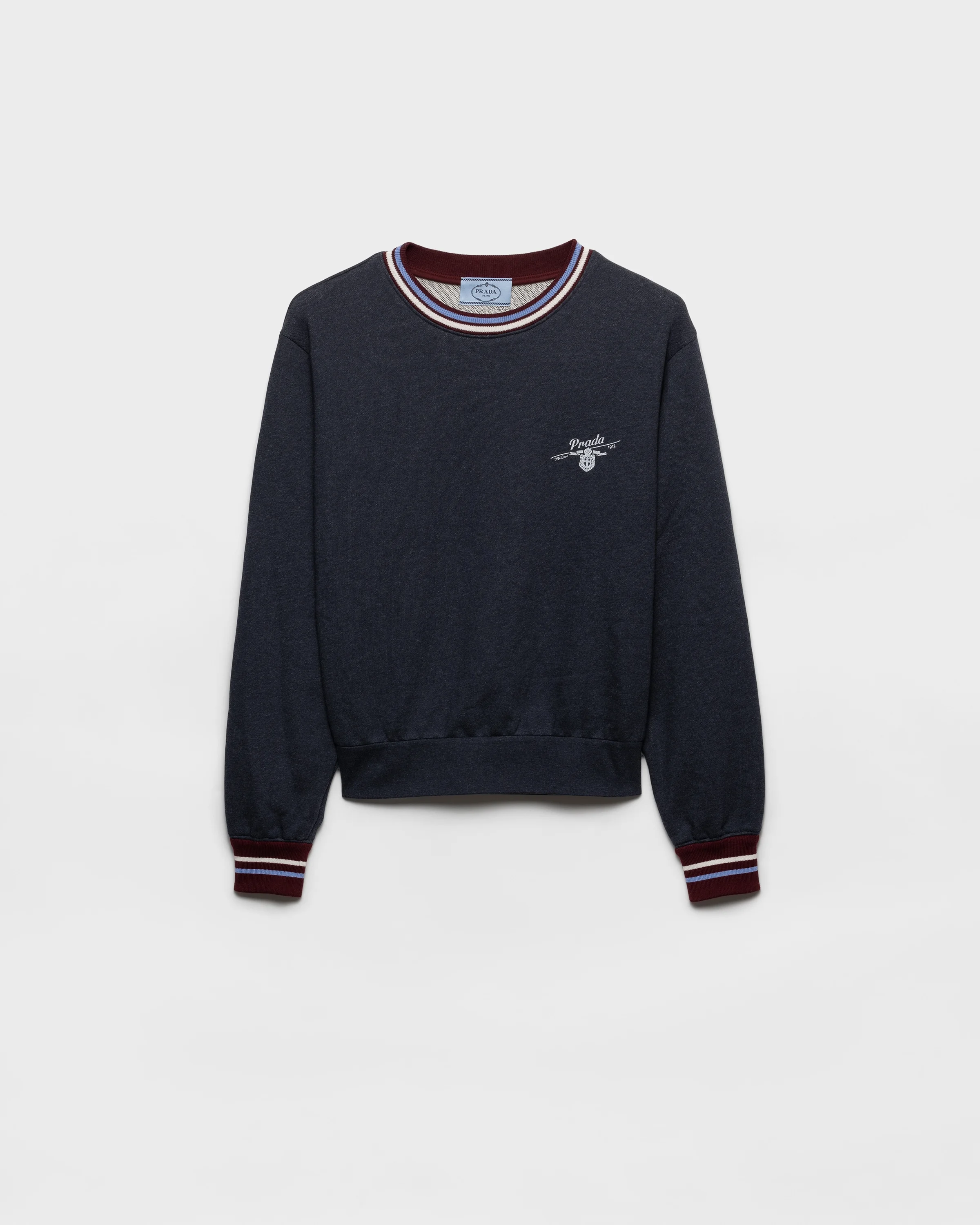An oversized silhouette adds interest to this crew-necked sweatshirt with contrasting details: the Prada logo on the front and the ribbed knit trim create a refined, hybrid mood for the style. - Product code: 134728_19IC_F01EC_S_OOO - Menswear fit - Long sleeves - Ribbed knit hem - Striped ribbed knit cuffs and crew-neck - Printed Prada logo - Imported - The model is 178 cm tall and wears a size 38 MATERIALS Main material: 100% Cotton