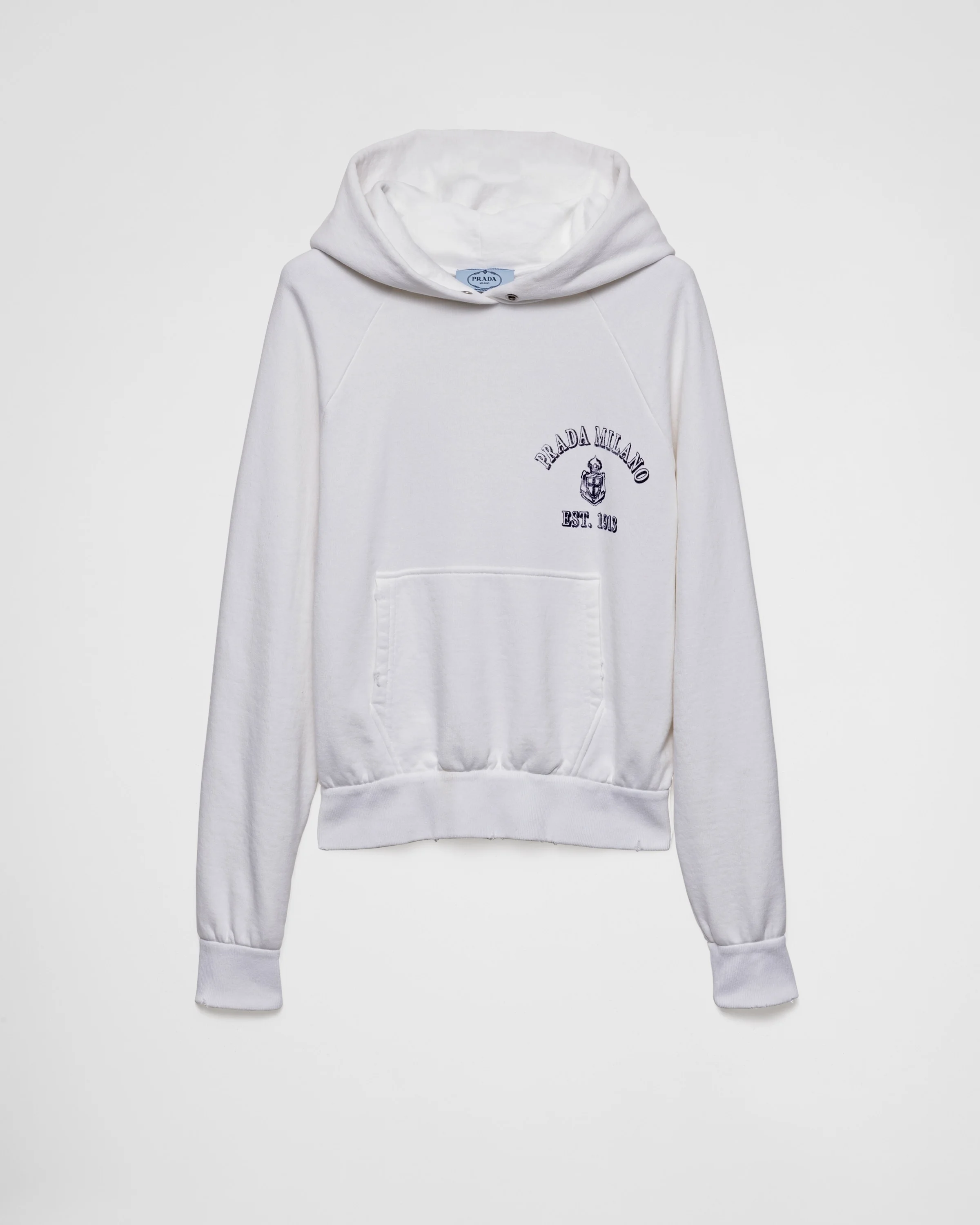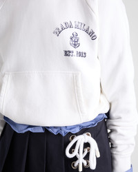 Sporty style and retro details are combined in the design of this cotton fleece hoodie, a reinterpretation of classic college styles. Made with artisanal techniques that create a used finish, the garment is completed with a charming vintage-look logo and the iconic knit triangle. - Product code: 134713_16V4_F0009_S_OOO - Boxy fit - Long sleeves - Ribbed knit hem - Ribbed knit cuffs - Patch pockets - Garment dyed - Printed logo on the front - Conceptual triangle on the back - Imported - The model is 179 cm tall and wears a size 38 Height: 59cm MATERIALS Main material: 100% cotton