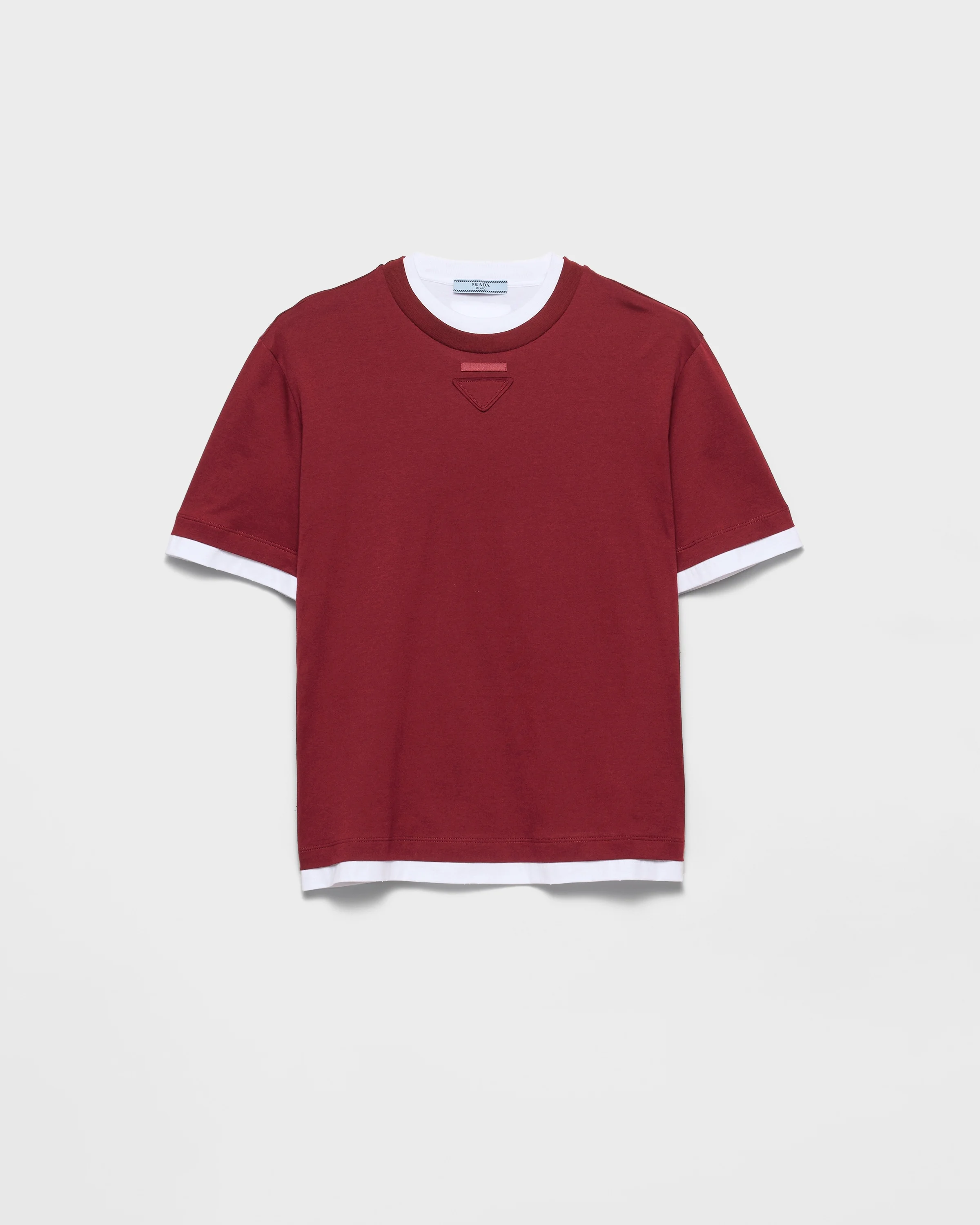 The T-shirt acquires a new character thanks to the layered design that adds dimension to this wardrobe staple. The jersey garment with a boxy silhouette is decorated with the tonal triangle logo. - Product code: 3547B_15ZG_F0399_S_AAO - Oversized fit - Ribbed knit crew neck - Short sleeves - Fabric triangle logo with sartorial label - Imported - The model is 177 cm tall and wears a size 38 Height: 65cm MATERIALS Main material: 100% cotton