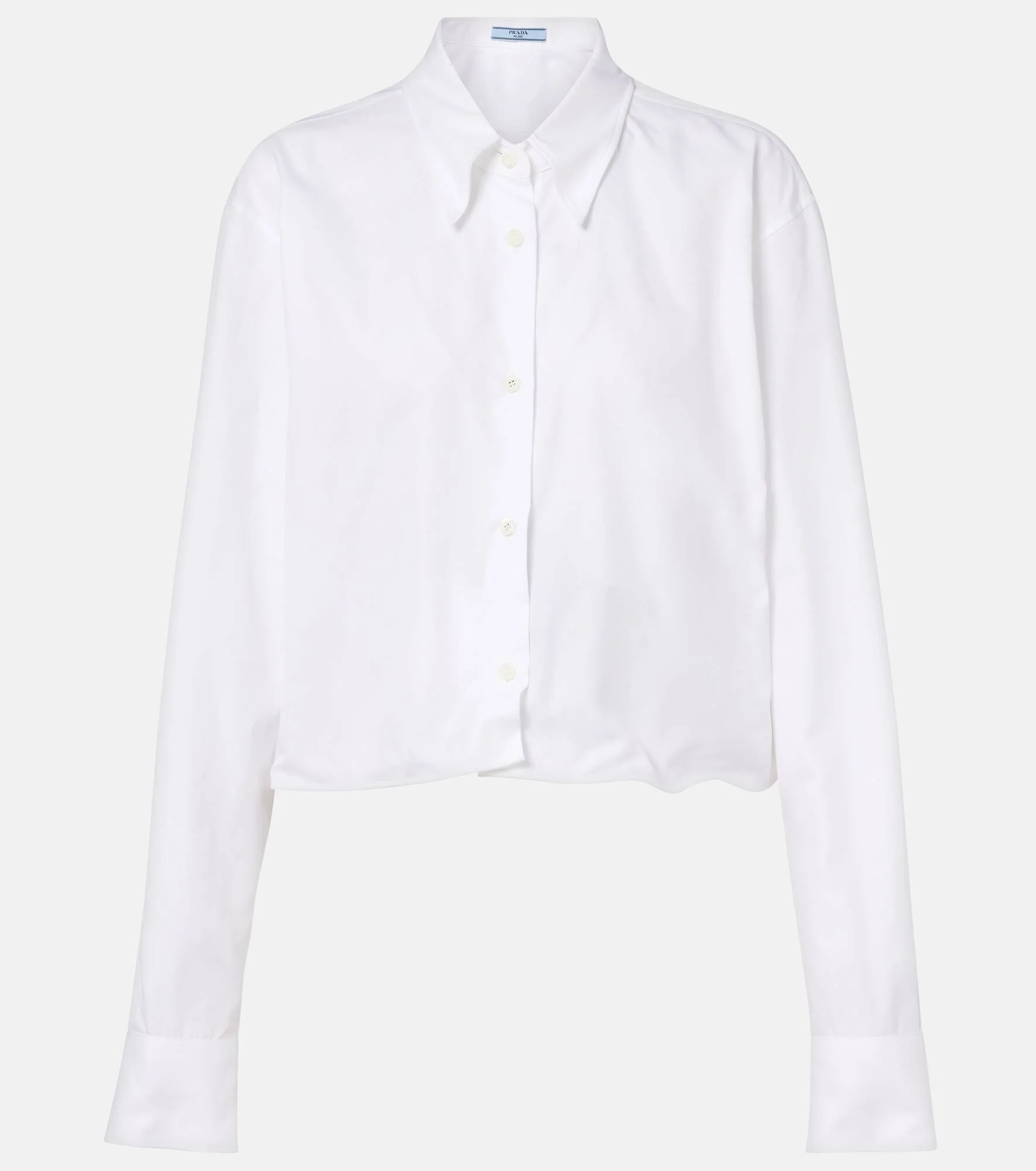 Prada embodies modern sophistication, blending timeless Italian craftsmanship with an innovative spirit. Made from crisp cotton poplin, this shirt boasts a slightly cropped silhouette and metal wires at the trims for a dynamic, shapeable finish. Product Details - Material: 100% cotton - Care instructions: hand wash - Made in Italy - Color: white - Designer color name: White - Item color: white - Contains non-textile parts of animal origin - Collar: classic (Straight point) - Closure: buttoned front - Cuff: buttoned - Item number: P01132934 Size & Fit - True to size - Designed for a loose fit - Non-stretchy fabric - Slightly cropped - Height of model is 175cm-69" and wears a size IT 40