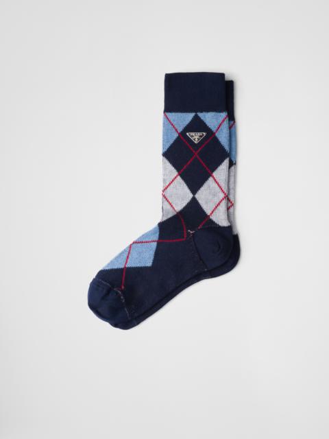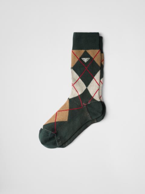 An argyle pattern with retro charm enriches these ankle socks made of soft cotton and decorated with the iconic enameled metal triangle logo. - Product code: 66562_15KA_F0342_S_OOO - Jacquard knit - Enameled metal triangle logo - Imported - The model is 180 cm tall and wears a size 38 - Height: 25cm MATERIALS Cotton