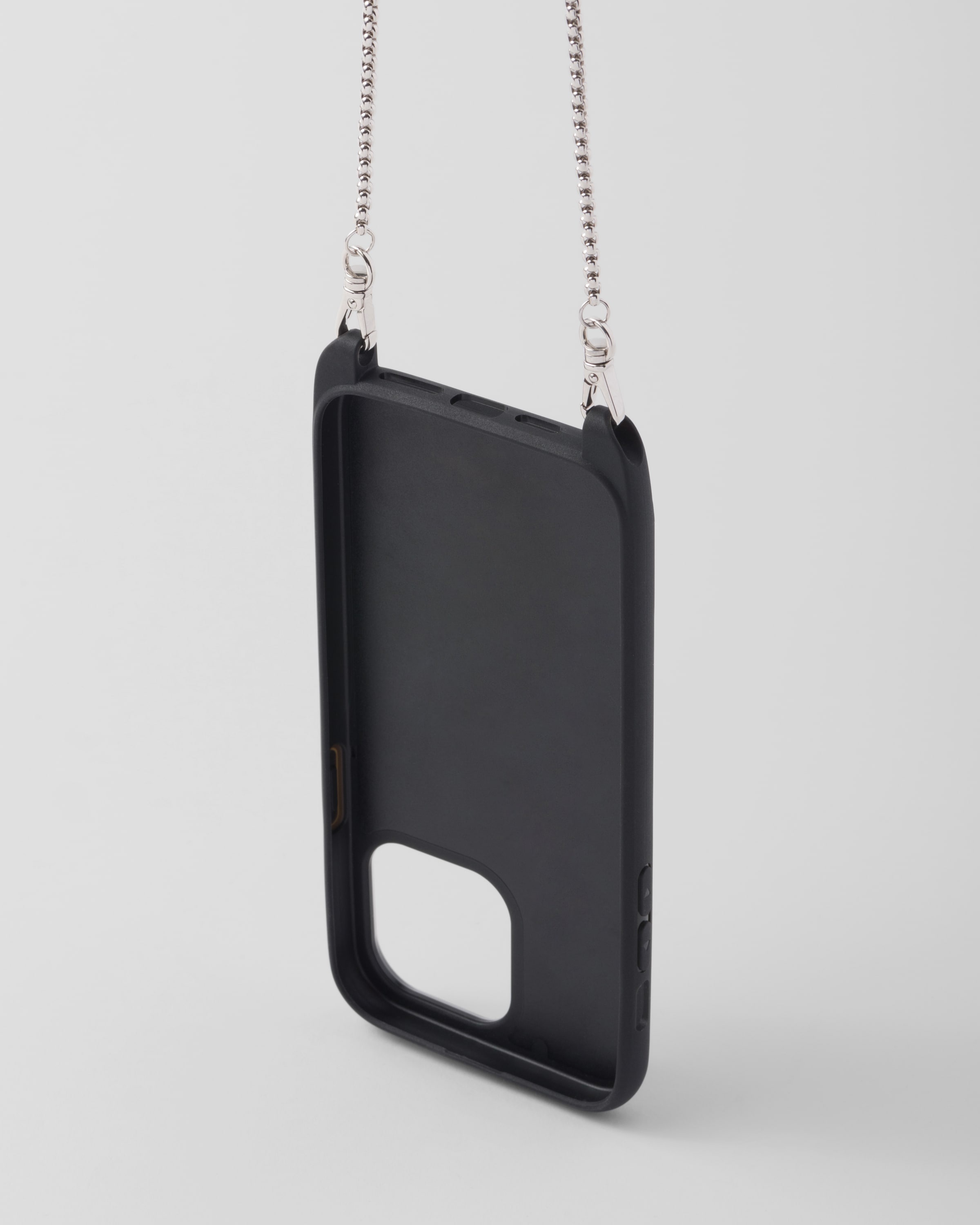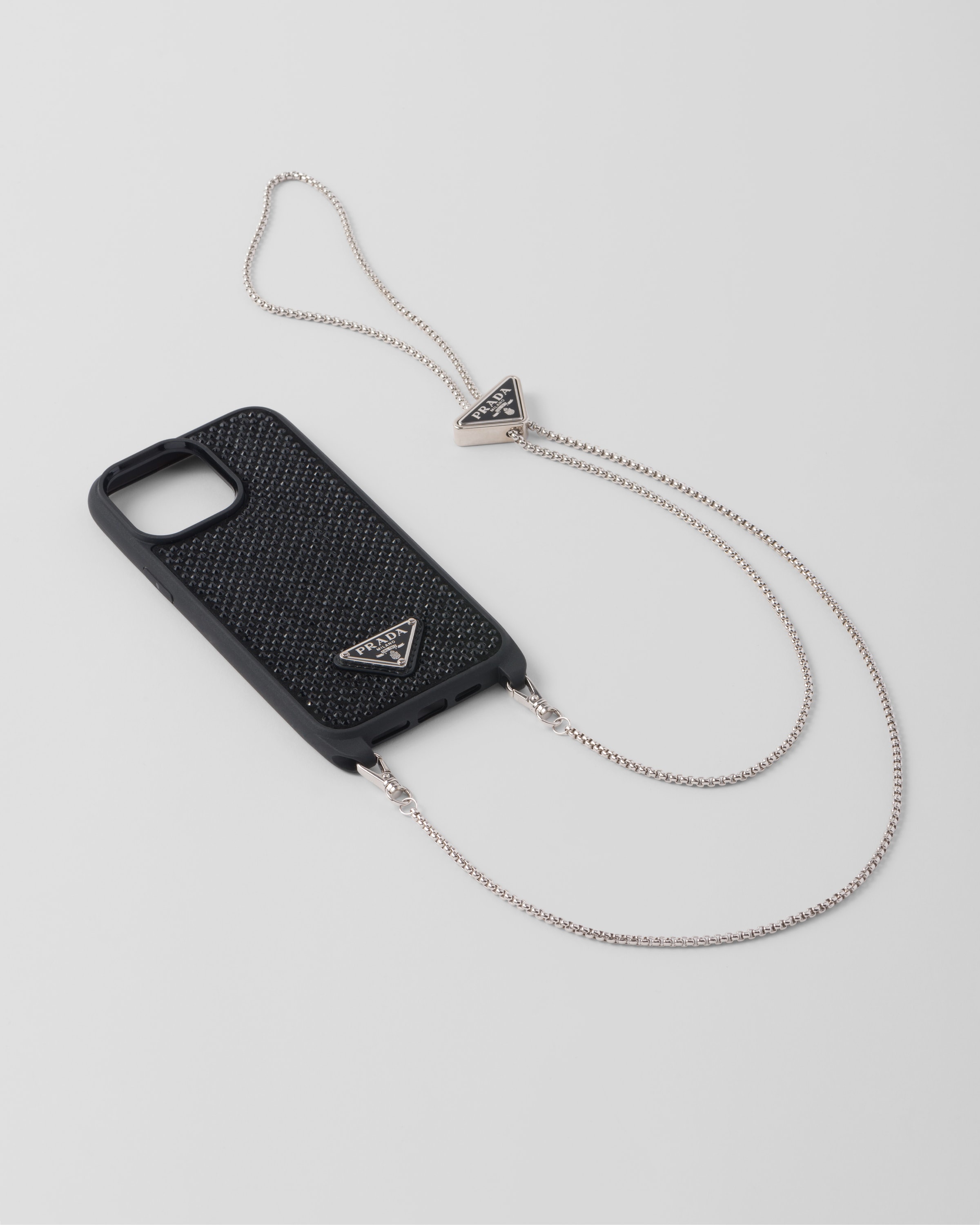 This sophisticated and versatile cover for the iPhone 14 Pro Max is illuminated with tonal crystals for a touch of modern elegance. The accessory, which comes with a metal chain for wear as a shoulder strap, is decorated with the iconic enameled metal triangle logo. - 제품 코드: 1ZH175_2AWL_F0002 - With synthetic crystals - Enameled metal triangle logo - Detachable chain shoulder strap - 높이: 16cm - 폭: 8cm