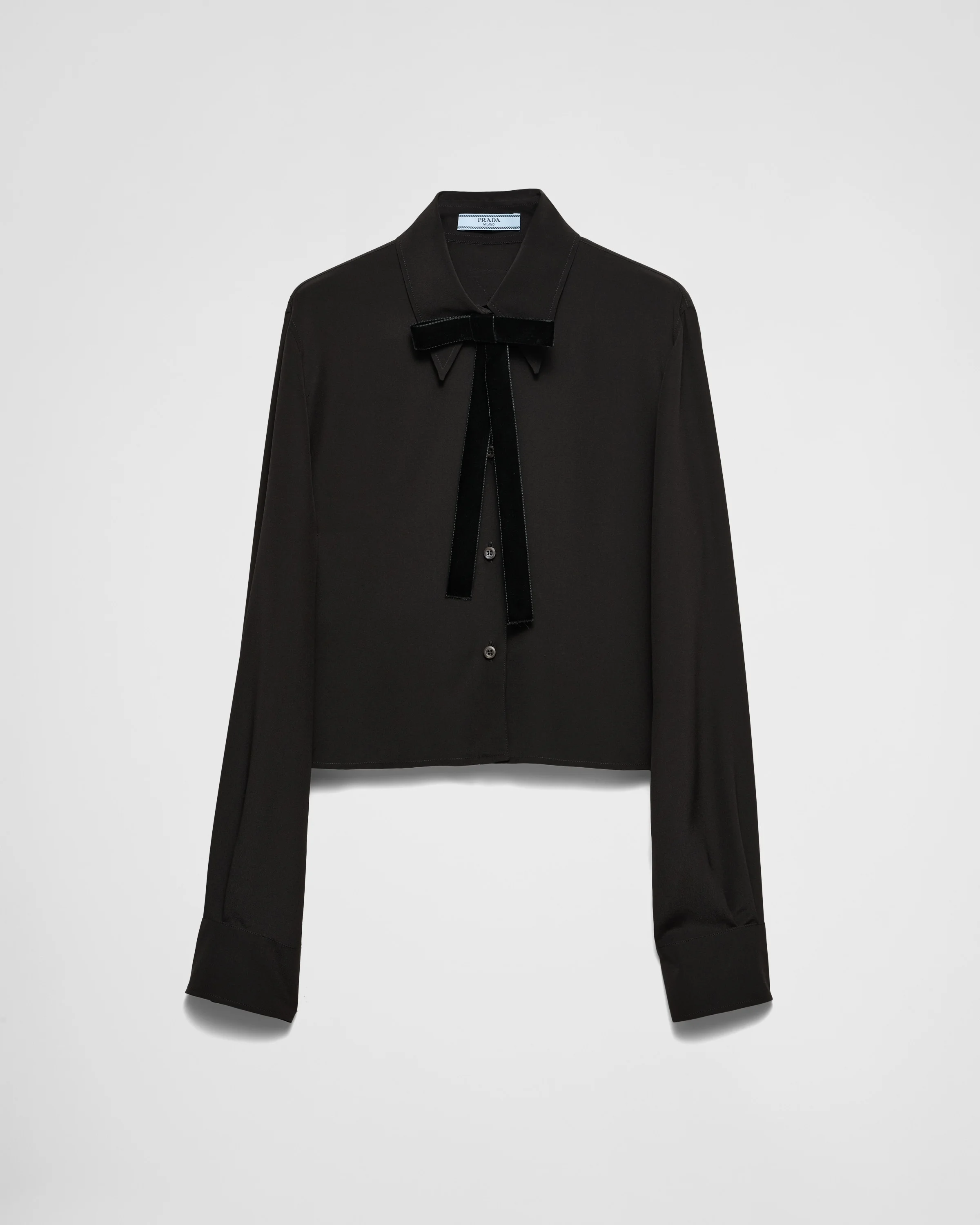 Elegant details and retro charm animate this crepe de chine shirt, characterized by a boxy silhouette embellished with a refined velvet bow on the collar. - Product code: P473FC_14KG_F0002_S_OOO - Boxy fit - Classic collar - Front button closure - Sleeves with classic cuffs - Three-dimensional fabric triangle logo - Velvet bow detail - Imported - The model is 180 cm tall and wears a size 38 Height: 46cm MATERIALS Main material: 100% silk