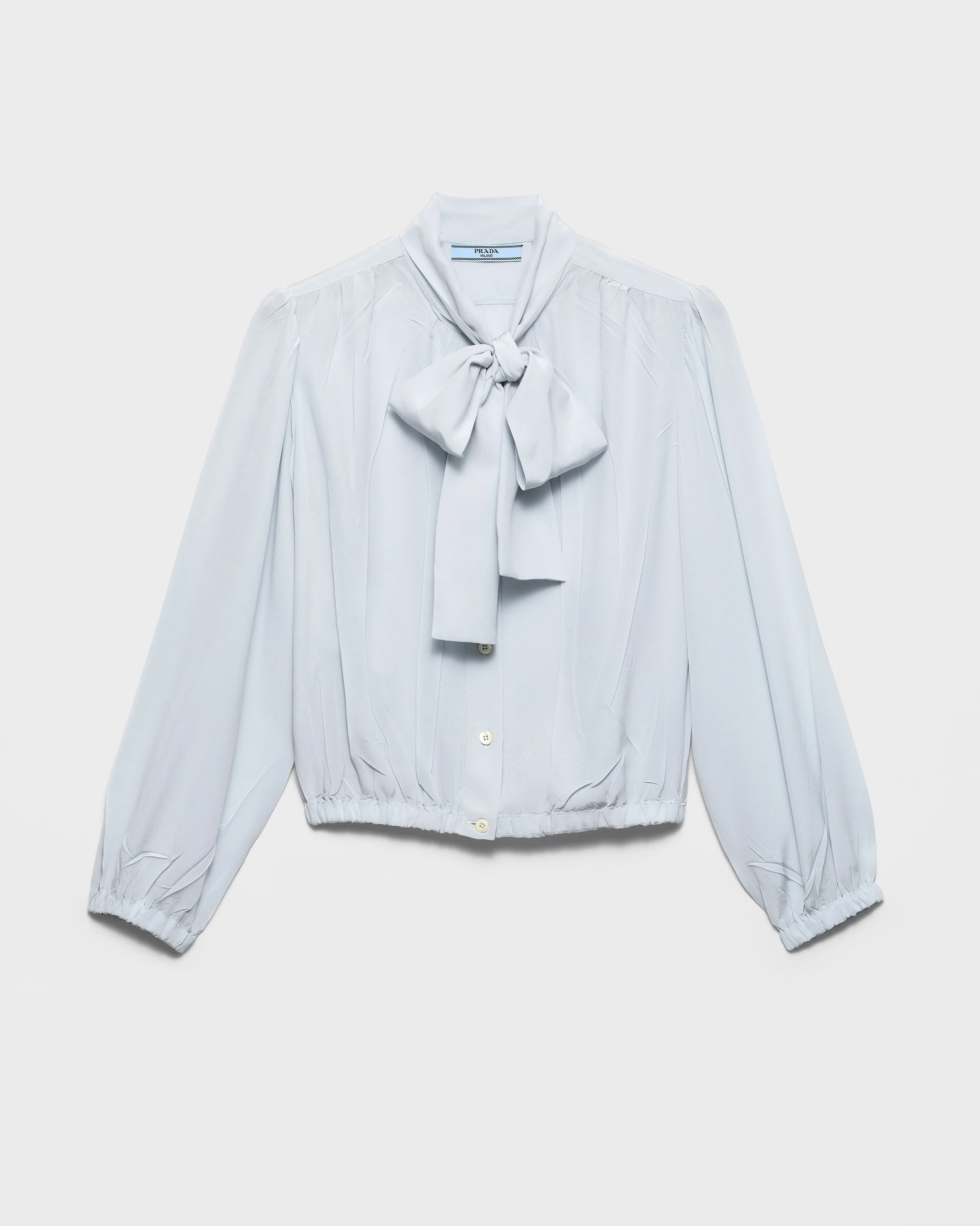 The elegant shirt is reinterpreted in crepe de chine with a distinctive vintage finish created by pressing the finished garment. An unexpected element, an expression of Prada's unconventional elegance, adds character to the sophisticated, feminine design. - Product code: P409J_12L0_F0M10_S_OOO - Straight fit - Collar with pussycat bow - Front button closure - Sleeves with elasticized cuff - Elasticized hem - Flat-pressed - Imported - The model is 178 cm tall and wears a size 38 MATERIALS Main material: 100% Silk
