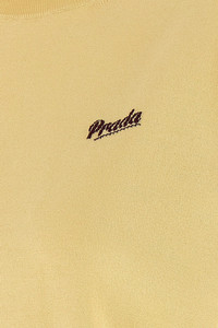 cod. P24B3DSOOO19DAF05BN Stretch silk sweater with contrasting front logo intarsia, crew neck, short cuffed sleeves, and headband on the hem. SUSTAINABLE: Product made with recycled materials. Color: Yellow Size & Fit: true to size fit Composition: 90% recycled silk, 10% polyamide Made in: Italy