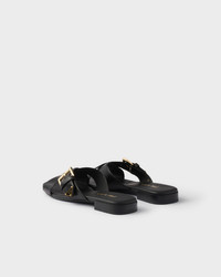 Refined lines and details define these leather sandals with versatile style, decorated with the triangle logo. The metal buckle, an iconic design that recalls the leather accessories collections, embellishes the upper with crisscross bands. - Product code: 1XX778_248_F0002_F_010 - Upper with logo-engraved metal buckle - Enameled metal triangle logo - Leather sole with hot-stamped logo - Leather-covered heel, 10 mm - Imported MATERIALS Main material: Calfskin