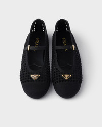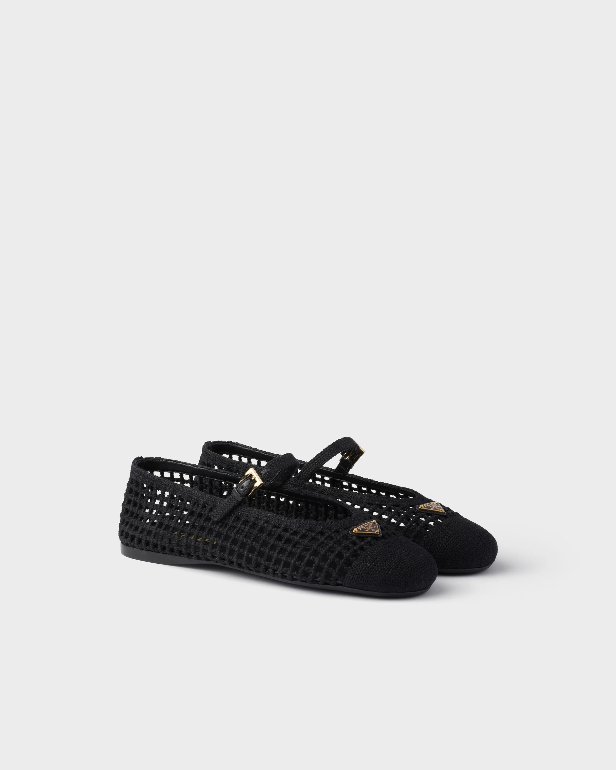 Feminine and timeless ballerina flats are reinterpreted with a delicate and light knit crochet design. The tapered silhouette with round toe and strap is embellished with the iconic enameled metal triangle logo. - Product code: 1F364O_2F46_F0002_F_005 - Upper with strap and logo-engraved metal buckle - Enameled metal triangle logo - Monoblock rubber sole, 5 mm, with hot-stamped logo - Imported MATERIALS Fabric/Leather