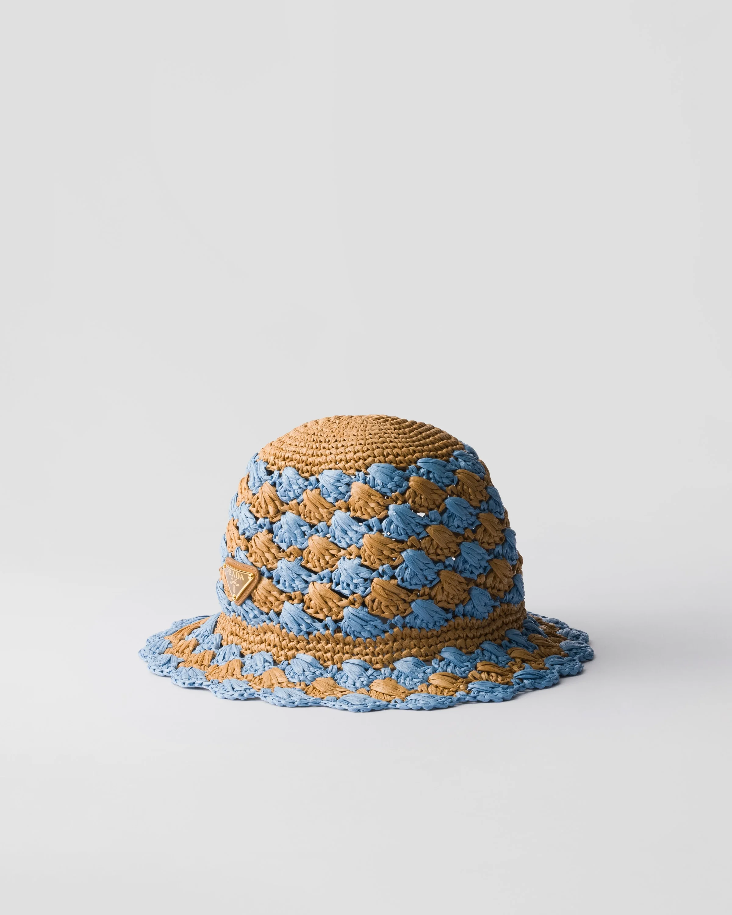 A refined handmade crochet pattern animates this hat with sophisticated style. - Product code: 1HC417_2CQ2_F04F4 - Raffia-effect yarn - Enameled metal triangle logo - Imported MATERIALS Main material: Brass