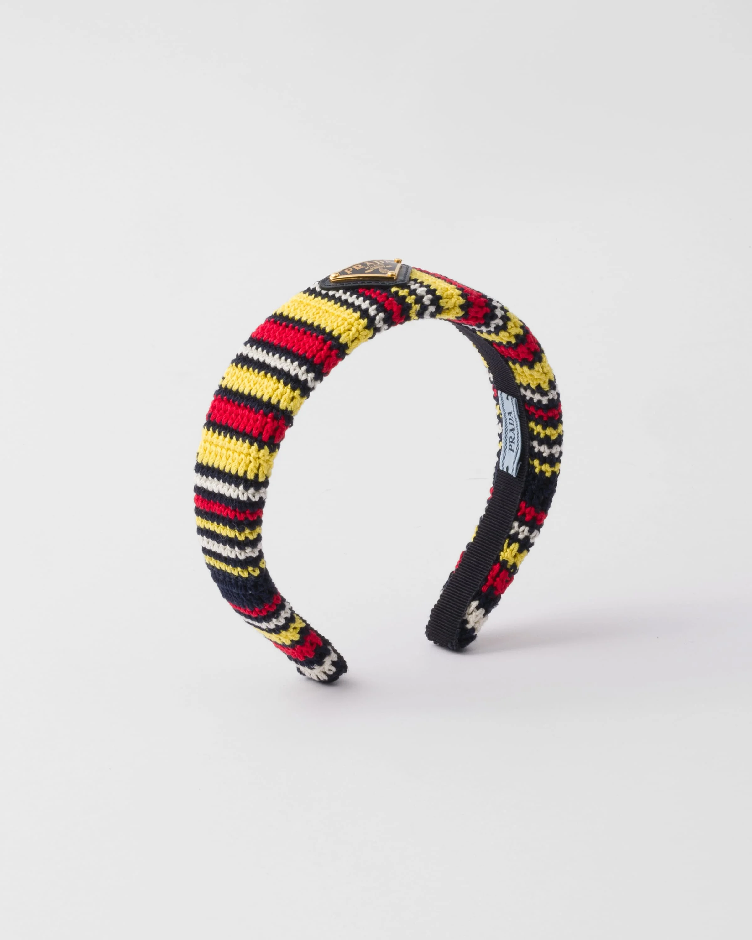 Colorful patterns animate this crochet headband decorated with the iconic enameled metal triangle logo. - Product code: 1IH019_2C83_F0853 - Enameled metal triangle logo - Imported Height: 4cm MATERIALS Main material: Cotton