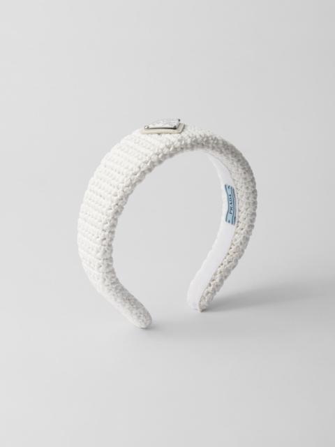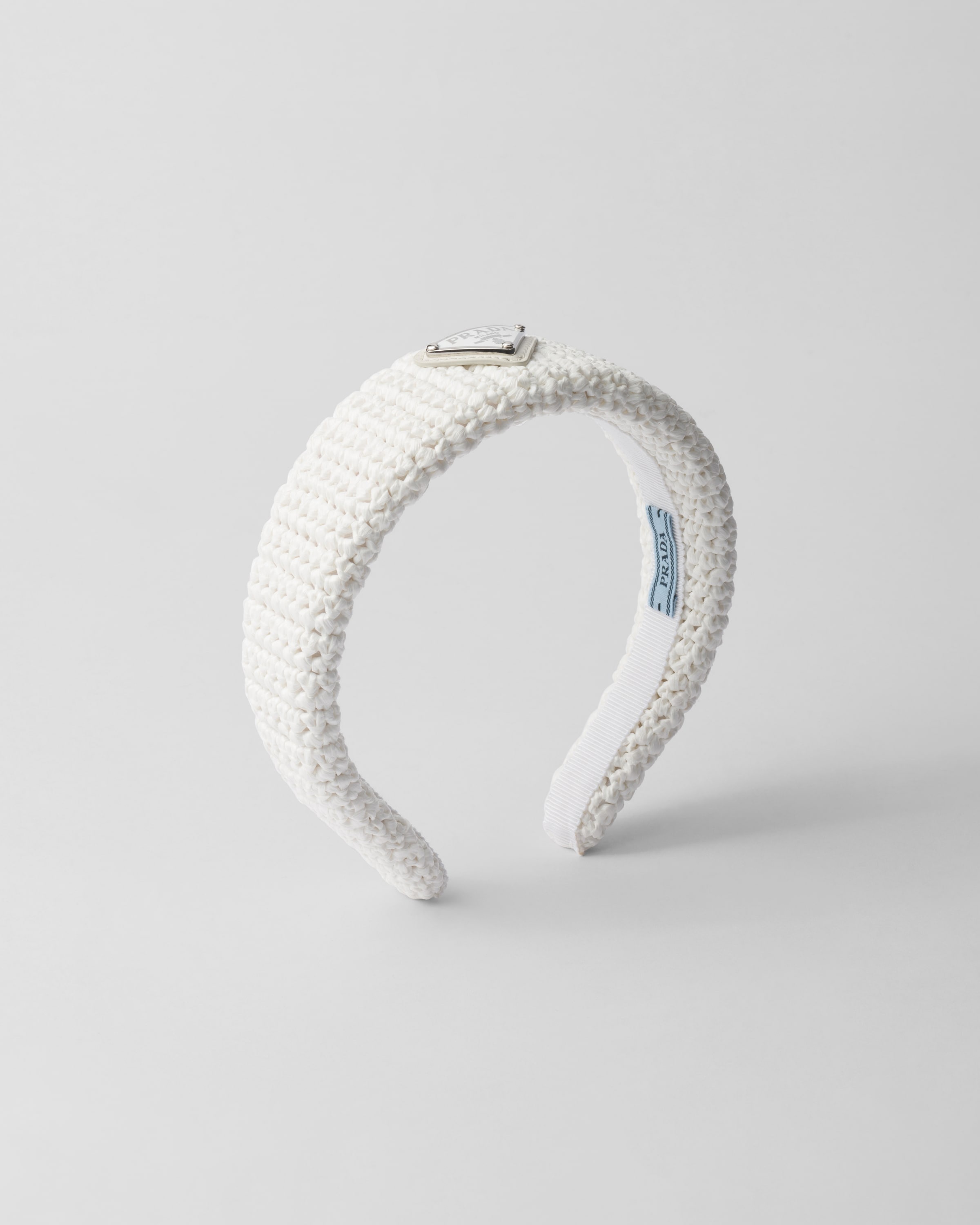 This headband with effortless elegance features classic lines and a summery mood. The enameled metal triangle logo decorates the accessory. - Product code: 1IH019_2CYC_F0009 - Raffia-effect yarn - Crochet workmanship - Enameled metal triangle logo - Imported Height: 4cm MATERIALS See material in product details