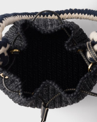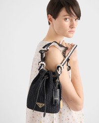 A refined pattern gives shape to this crochet mini bucket bag. Leather details embellish the accessory that evokes summer. - Product code: 1BE068_2MHA_F0002_V_OVZ - Cotton cord handle - Detachable, adjustable leather shoulder strap. Maximum length 110 cm - Minimum length 100 cm - Maximum drop 55 cm - Minimum drop 50 cm - Removable leather key ring - Metal hardware - Enameled metal triangle logo on the front - Drawstring closure with leather lace - Lined - Imported Height: 19.5cm Width: 15.5cm Length: 10cm MATERIALS Main material: Viscose