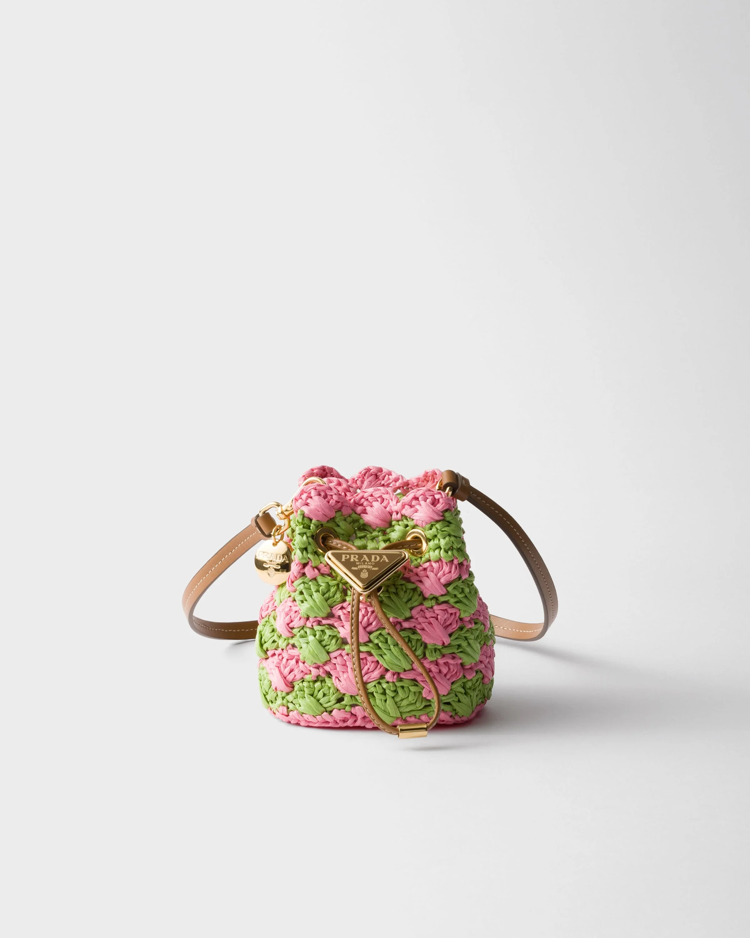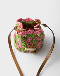 Leather details and crochet workmanship add a light touch and refined allure to this mini pouch. The enameled metal triangle logo completes the accessory with an iconic note. - Product code: 1NR040_2CQ2_F0WHE - Drawstring closure - Enameled metal triangle logo on closure - Removable leather shoulder strap - Imported Height: 9.5cm Width: 9cm Length: 6cm MATERIALS Main material: Steel