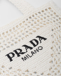 This crochet tote bag with a soft, deconstructed design boasts a light and summery mood. A new interpretation of Prada's emblematic triangle decorates the front and is embellished at its center with the embroidered lettering logo. - Product code: 1BG393_2A2T_F0009_V_OOO - Raffia-effect yarn - Crochet workmanship - Embroidered lettering logo on the front - Unlined - Imported Height: 38cm Width: 36cm Length: 3cm MATERIALS Main material: Viscose