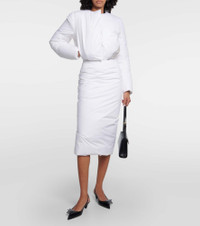Inspired by the duvet, this cropped cotton jacket seamlessly fuses the ordinary with the extraordinary. It introduces a contemporary twist with goose-down padding and is adorned with a jacquard label and triangle logo on the back. Product Details - Material: 100% cotton - Care instructions: machine wash at 30 degrees - Made in Italy - Designer color name: Bianco+Panna - Filling: 90% down, 10% goose feathers - Contains non-textile parts of animal origin - Lining: 100% cotton - Closure: snap-buttoned front - Pockets: side slit pockets - Item number: P00850698 Size & Fit - True to size - Cinched waist - Thick material - Cropped - The model seen in the picture is 178cm-5'10" and wearing a size IT 40