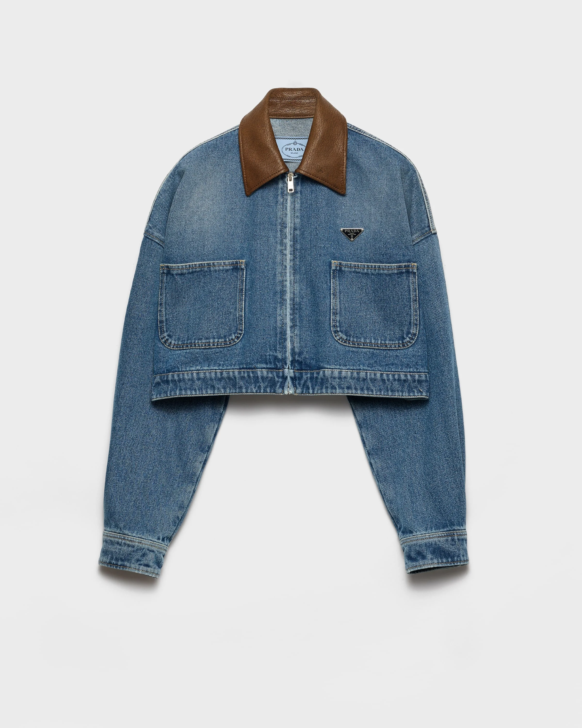 The denim jacket is reinterpreted with a contemporary design and refined details. The garment with a cropped cut is embellished with a leather collar, while the enameled metal triangle logo completes it with an iconic note. - Product code: GFB327_16PK_F0V3N_S_OOO - Used denim treatment - Unlined garment - Leather collar - Long sleeves, cuffs with two buttons - Front zipper closure - Contrasting top-stitching - Low patch pockets - Center-back length: 46 cm, Size: 38 - Straight hem with adjustable double buttons on the back - Triangle logo - Imported - The model is 178 cm tall and wears a size 38 Height: 46cm MATERIALS Main material: 100% cotton