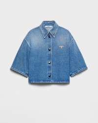 This cropped denim shirt characterized by clean, ample lines expresses contemporary allure. The style with a used finish is decorated with the iconic enameled metal triangle logo. - Product code: GFC061_16PK_F0V3N_S_OOO - Used treatment - Classic fit - Unlined - Shirt collar - Front button closure - Short sleeves - Contrasting stitching - Triangle logo - Center-back length: 48 cm, Size: 38 - Imported - The model is 177 cm tall and wears a size 38 Height: 48cm MATERIALS Main material: 100% cotton