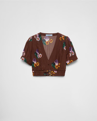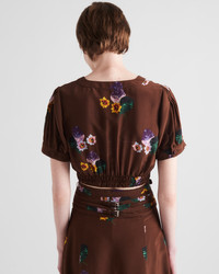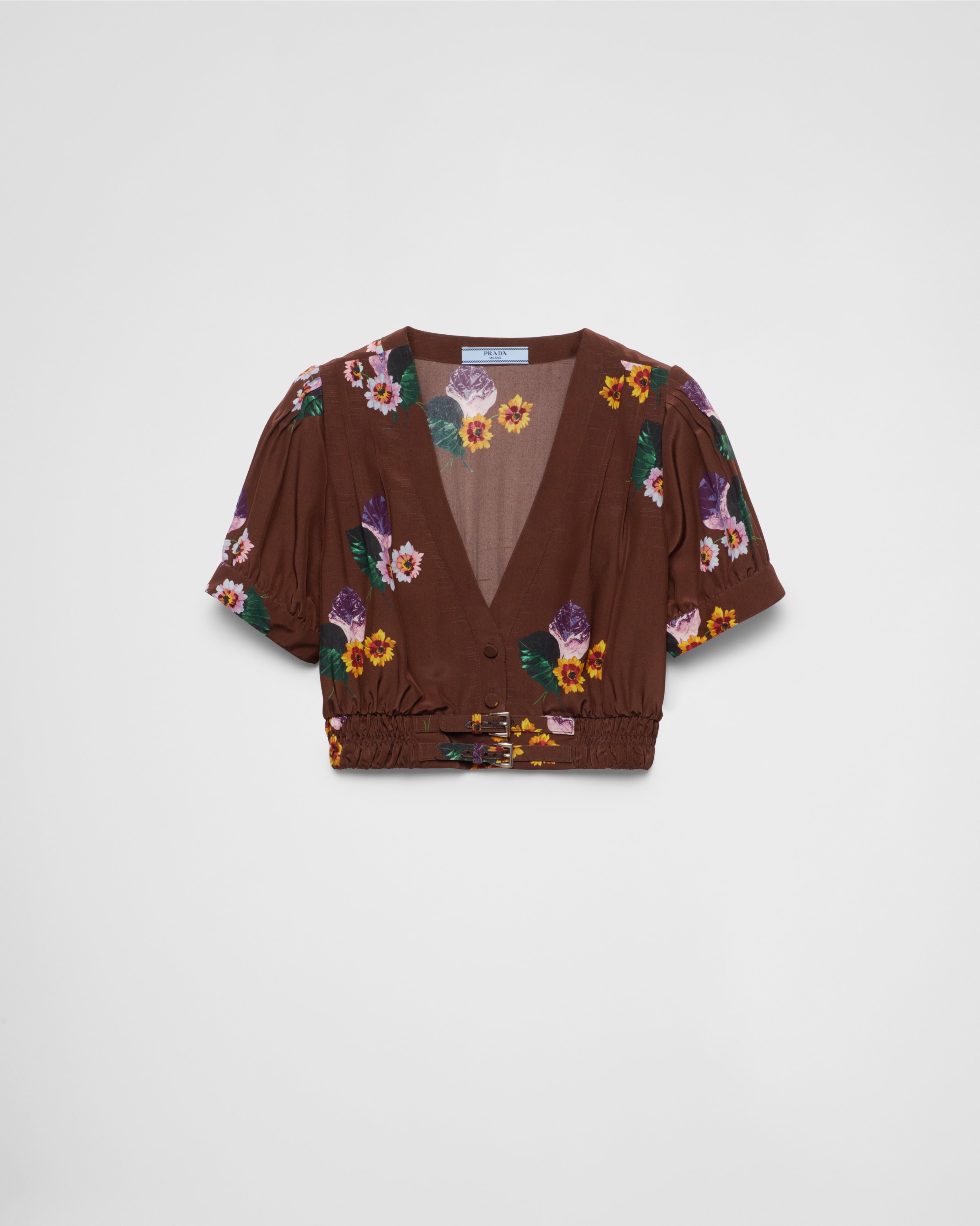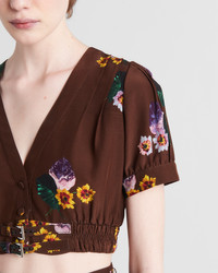 A lively floral print animates this short-sleeved pongé shirt. This style with modern, feminine charm has a cropped silhouette defined by the V-neck. - Code du produit: P441HK_15CI_F0324_S_OOO - «Zinnia» print - Slim fit - V-neck - Snap closure on the front - Short sleeves - Fabric triangle logo - Importé - The model is 178 cm tall and wears a size 38 - Taille: 37cm