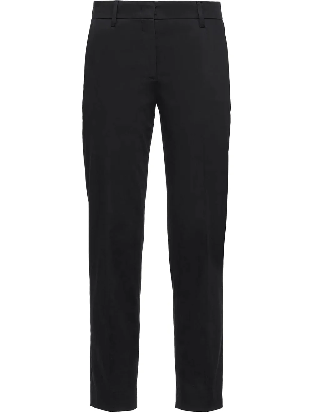 cropped tailored trousers You can't go wrong with a pair of black trousers. Wear them anywhere, with anything, in the office or out a night. Opt for these cropped tailored trousers from Prada, because, well you can't go with Prada either. Highlights - Black - Cotton - Cropped leg - Hook and zip fly fastening - Belt loops - Two side inset pockets - Two rear welt pockets Composition Cotton 95%, Spandex/Elastane 5% Washing instructions Dry Clean Only