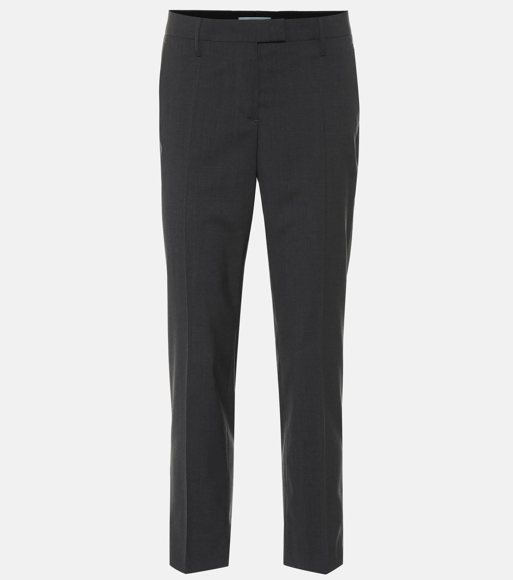A wardrobe staple that can be styled in a myriad of ways, these gray cropped pants from Prada are rendered with the label's signature contemporary sophistication. Tailored in Italy, this mid-rise style falls into straight legs that crop artfully at the ankle. Silver-hued zips appear at the back of hemline, for a subtle hint of subversion. Product Details - Material II: 100% cotton - Made in Italy - Designer color name: Grey - Material: 100% virgin wool - Closure: concealed zipper, hook-fastening front, concealed buttoned front, zipped front - Pocket lining: 100% cupro - Belt loops - Pockets: side slit pockets, back pockets - Item number: P00364771 Size & Fit - True to size - Straight leg - The model seen in the picture is 178cm-5'10" and wearing a size IT 40