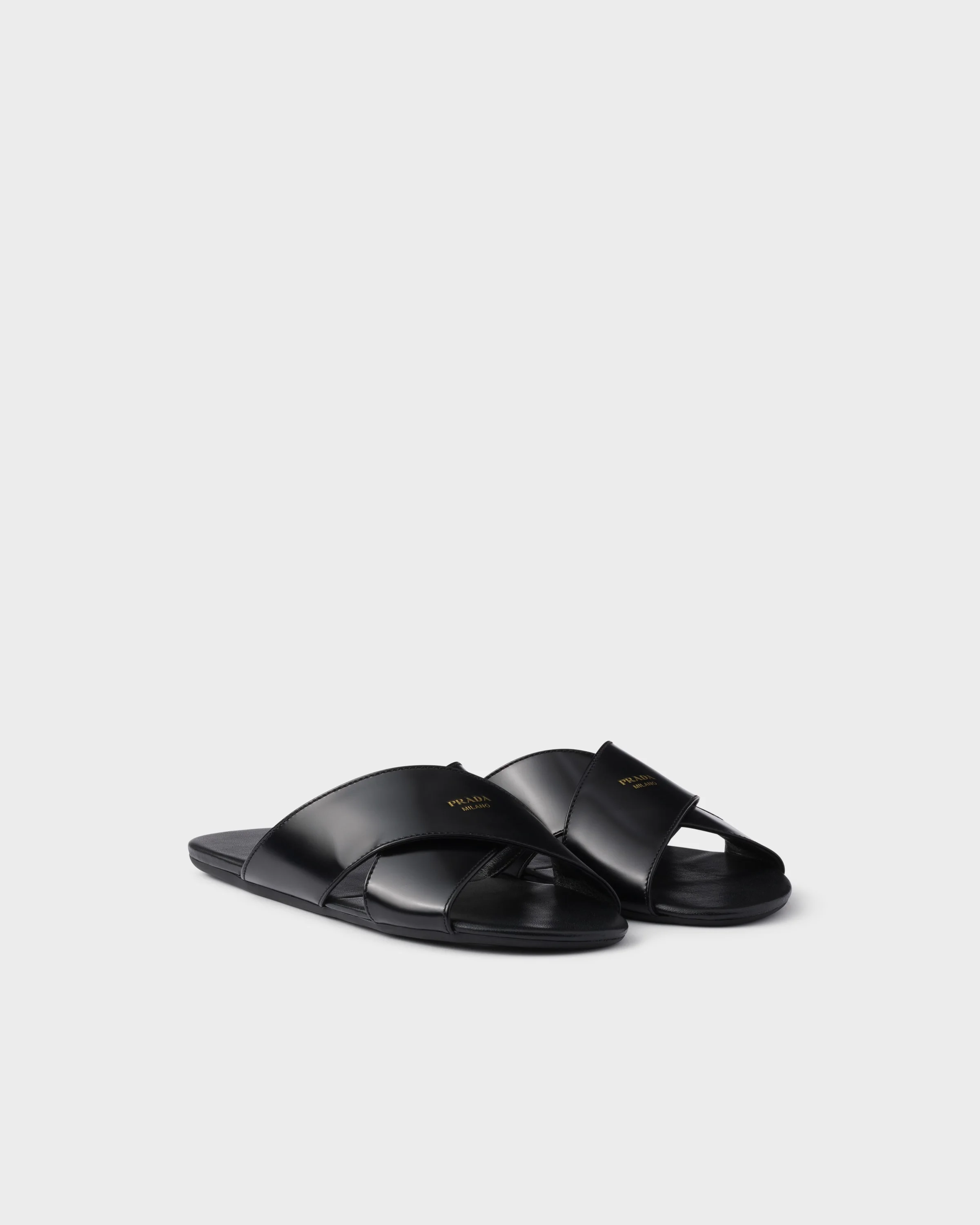 The minimalist design of these brushed leather sandals is defined by an upper with crisscross bands embellished with the lettering logo. The thin rubber soles give a versatile character to the refined footwear. - Product code: 1XX768_055_F0002_F_005 - Screen-printed logo - Monoblock rubber sole, 5 mm, with hot-stamped logo - Imported MATERIALS Main material: Calfskin