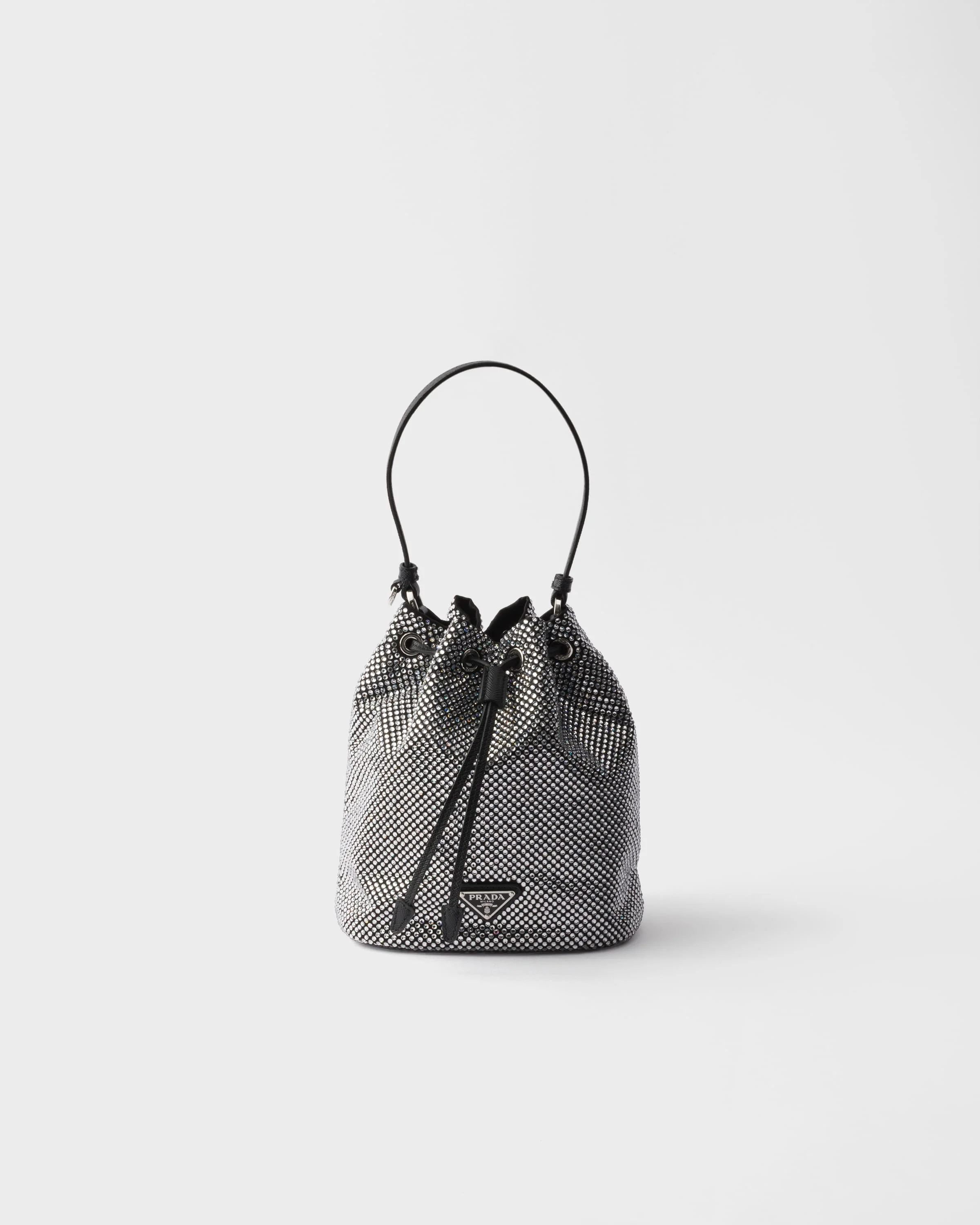 The iconic bucket bag is reinterpreted with a luxurious design in satin covered in crystals applied by hand. Refined details in Saffiano leather, Prada's emblematic material, complete the elegant and versatile accessory. - Product code: 1BE067_2HNJ_F0T7O_V_OOD - Synthetic crystals - Leather handle - Detachable, adjustable leather shoulder strap. Maximum length 105 cm - Minimum length 97 cm - Maximum drop 54 cm - Minimum drop 50 cm - Metal hardware - Enameled metal triangle logo on front - Drawstring closure - Logo-print nylon lining - Imported Height: 19.5cm Width: 15.5cm Length: 10cm MATERIALS Main material: Silk viscose
