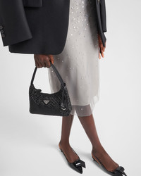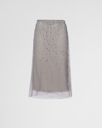 This elegant and feminine tulle skirt is brightened by a delicate play of crystals applied with a gradient effect. The light silhouette with flared lines is decorated with the iconic fabric triangle logo on the back. - Product code: P105JR_13ZD_F073X_S_OOO - Flared fit - Garment with slip - Side button and hook closure - Embroidered fabric triangle logo - Gradient rhinestone embellishment - Imported - The model is 180 cm tall and wears a size 38 Height: 70cm MATERIALS Nylon