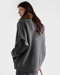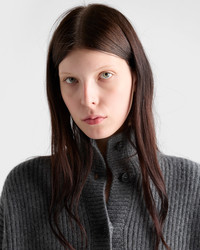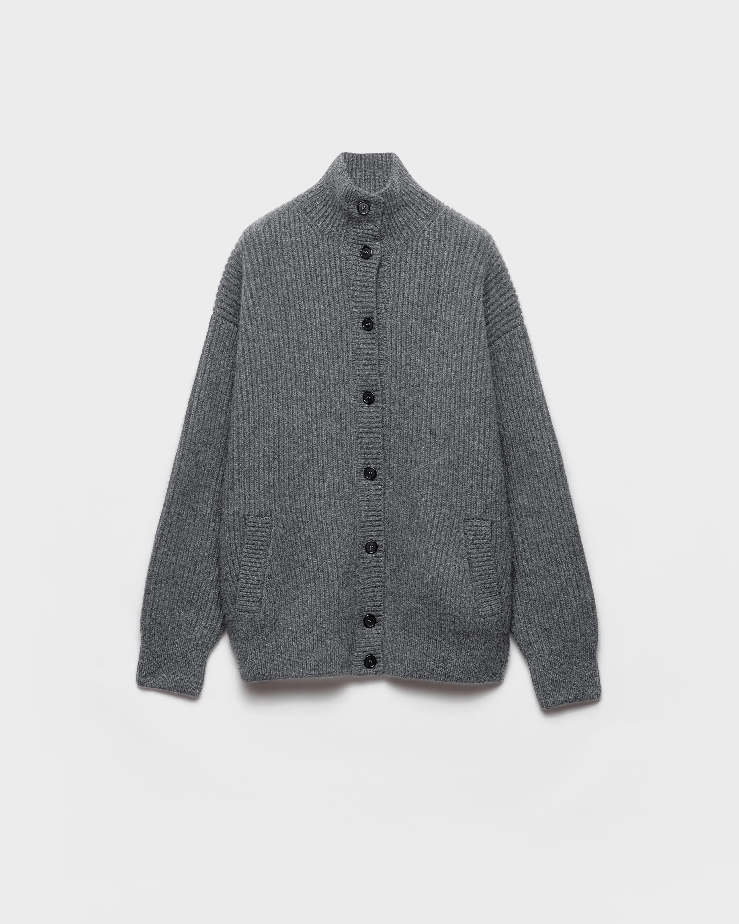 Prada knitwear combines classic lines, refined workmanship and precious materials in elegant, timeless designs. Cashmere adds a soft, warm and comfortable feel to this ribbed knit cardigan with an oversized fit. - Product code: P25N70_172A_F0480_S_OOO - Long sleeves - Ribbed knit - Oversized fit - Drop shoulder - Knit triangle logo - Front button closure - Imported - The model is 180 cm tall and wears a size 38 Height: 70cm MATERIALS Main material: 100% cashmere