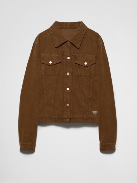 This denim blouson jacket is reinterpreted with sleek, original details that add a new character to the timeless style. The silhouette enriched with a stylish bowling collar acquires sporty allure with vintage charm. The iconic geometric shape of the enameled metal triangle logo completes the garment with a distinctive note. - Product code: GFB311_148J_F0557_S_OOO - Garment-dyed and washed treatment - Unlined garment - Classic fit - Bowling collar - Long sleeves with one-button cuffs - Front button closure - Matching stitching - Flapped patch pockets with button - Center-back length: 58 cm, Size: XS - Straight hem with buttons for double adjustment on the back - Triangle logo - Strap with buckle on the back - Prada Milano logo label on the back - Imported - The model is 178 cm tall and wears a size 38 Height: 58cm MATERIALS Main material: 100% cotton