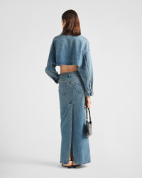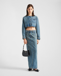This jacket made of washed denim, for an alluring vintage effect, features a cropped cut and relaxed fit. The round neck silhouette is brightened with jewel buttons and decorated with the iconic enameled metal triangle logo. - Product code: GFB309_13Z6_F0BAN_S_OOO - Washed denim - Unlined - Loose fit - Round neck - Long sleeves, one-button cuffs - Contrasting top-stitching - Front patch pocket - Length from back: 40 cm. Size: 38 - Straight hem - Triangle logo - Jeweled button front closure - Imported - The model is 180 cm tall and wears a size 38 - Height: 40cm MATERIALS Cotton